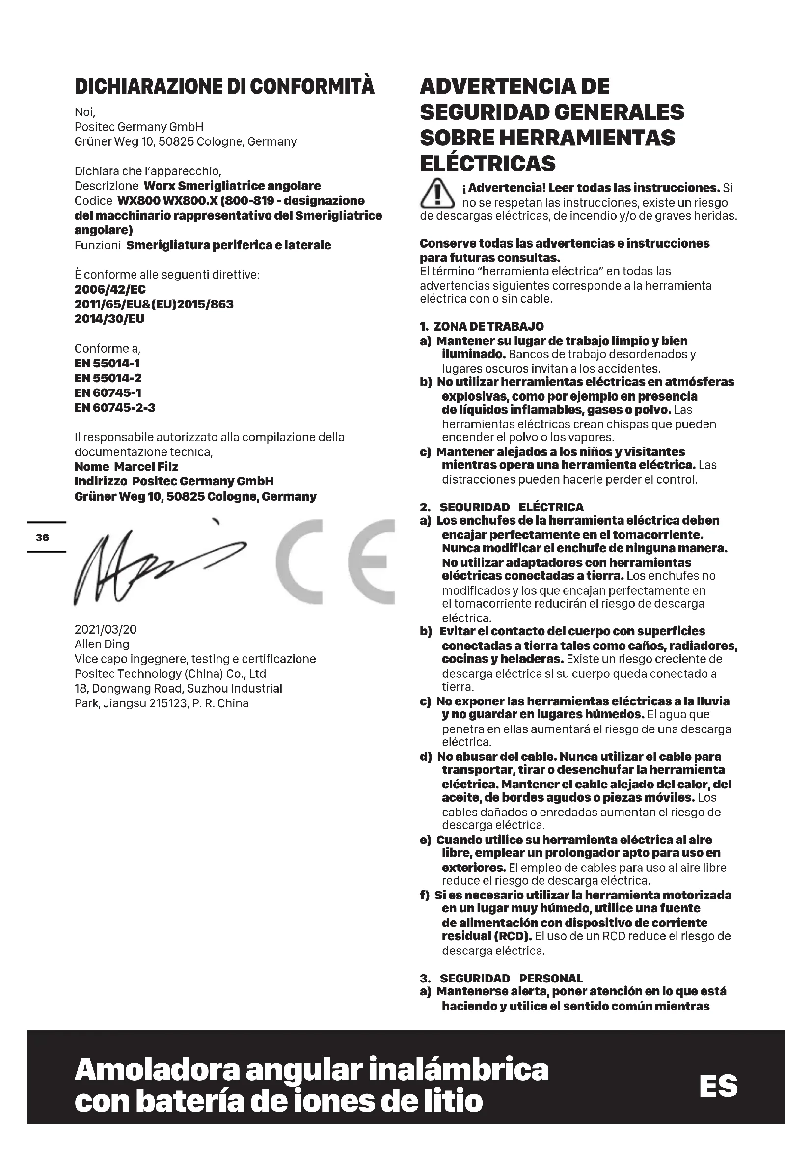 CONFORMIDAD Los que reciben, Positec Germany GmbH Grüner Weg 10, 50825 Cologne, Germany Declaran que el producto Descripción Worx Amoladora Angular Modelo WX800 WX800.X (800-819 -- designación denominaciones de maquinaria, representantes de Amoladora Angular) Modelo Afilado periférico y lateral Cumple con las siguientes Directivas: 2006/42/EC 2011/65/EU&(EU)2015/863 2014/30/EU Cumple las normativas EN 55014-1 EN 55014-2 EN 60745-1 EN 60745-2-3 La persona autorizada para componer el archivo técnico, Nombre Marcel Filz Dirección Positec Germany GmbH Grüner Weg 10, 50825 Cologne, Germany 2021/03/20 Allen Ding Ingeniero Jefe Adjunto. Pruebas y Certificación. Positec Technology (China) Co., Ltd 18, Dongwang Road, Suzhou Industrial Park, Jiangsu 215123, P. R. China44
