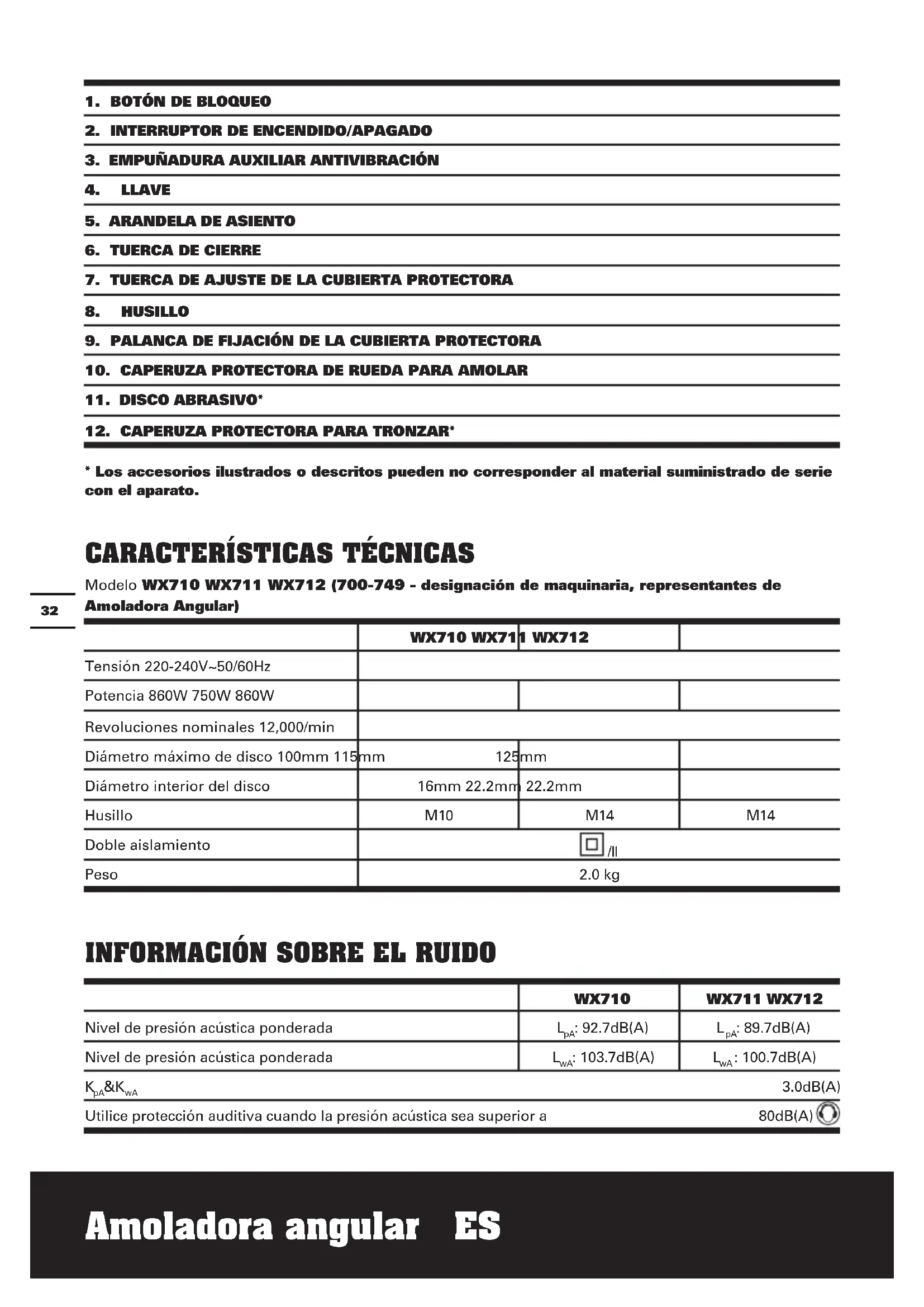 Modelo WX710 WX711 WX712 (700-749 - designación de maquinaria, representantes de Amoladora Angular) WX710 WX711 WX712 Tensión 220-240V~50/60Hz Potencia 860W 750W 860W Revoluciones nominales 12,000/min Diámetro máximo de disco 100mm 115mm 125mm Diámetro interior del disco 16mm 22.2mm 22.2mm Husillo M10 M14 M14 Doble aislamiento /ll Peso 2.0 kg