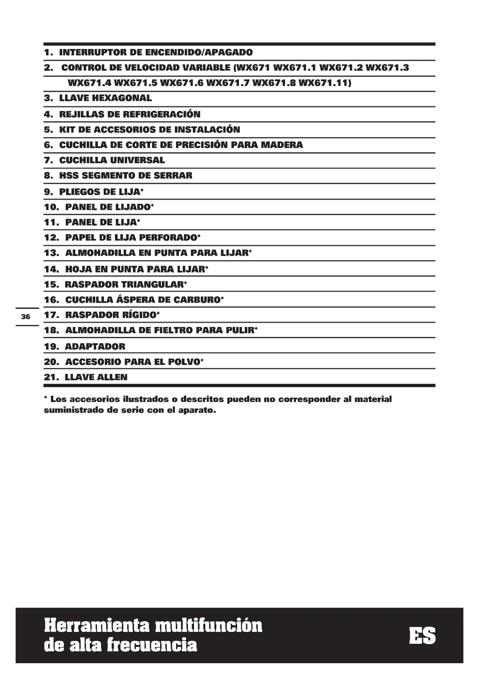 (WX671 WX671.1 WX671.2 WX671.3 WX671.4 WX671.5 WX671.6 WX671.7 WX671.8 WX671.11) Seleccione la frecuencia de oscilación (velocidad) mientras el motor se encuentre funcionando. El control de velocidad variable (2) se puede utilizar para configurar la frecuencia de oscilación óptima de acuerdo con el accesorio utilizado y su aplicación. Frecuencia de oscilación elevada: para lijar, aserrar, limar y pulir piedra o metal. Frecuencia de oscilación reducida: para pulir pintura.