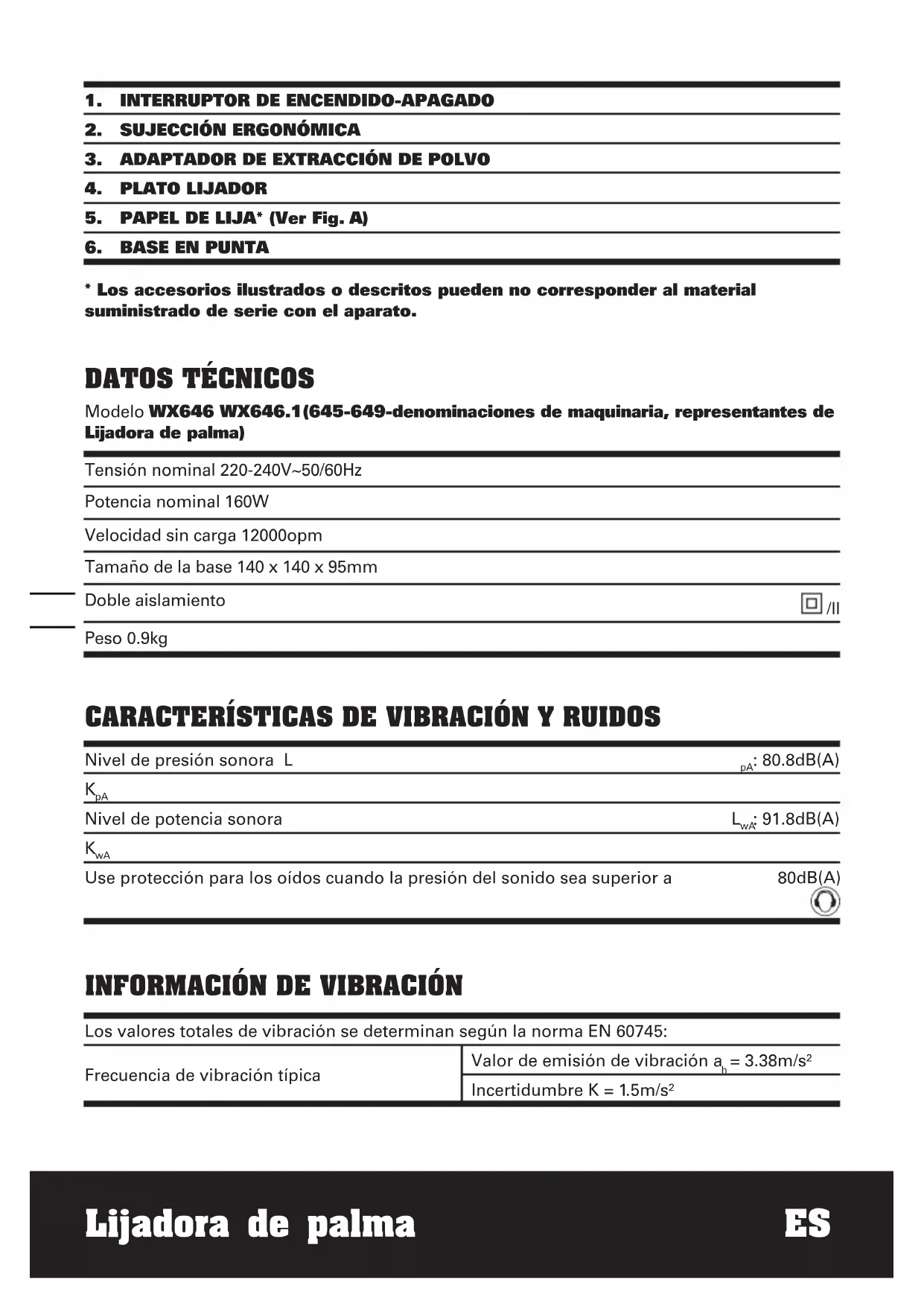 Modelo WX646 WX646.1(645-649-denominaciones de maquinaria, representantes de Lijadora de palma) CARACTERÍSTICAS DE VIBRACIÓN Y RUIDOS Nivel de presión sonora L