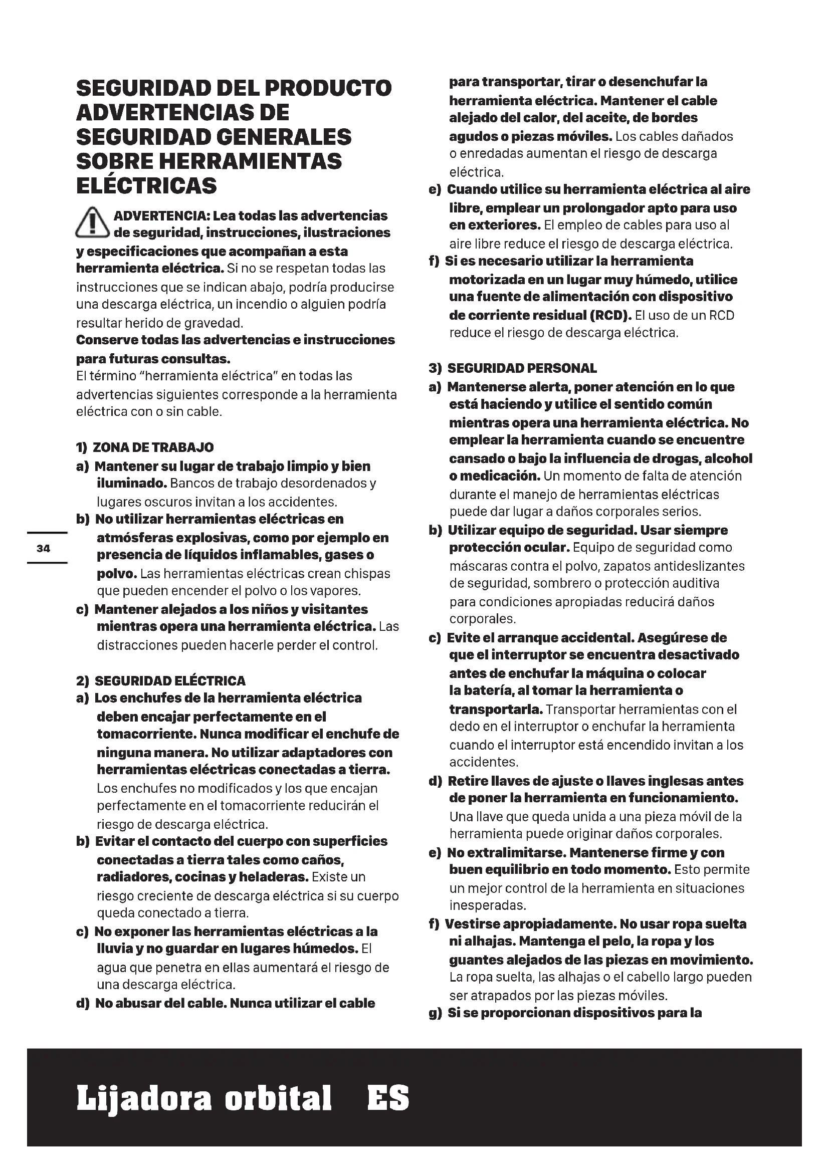 a) Mantenerse alerta, poner atención en lo que está haciendo y utilice el sentido común mientras opera una herramienta eléctrica. No emplear la herramienta cuando se encuentre cansado o bajo la influencia de drogas, alcohol o medicación. Un momento de falta de atención durante el manejo de herramientas eléctricas puede dar lugar a daños corporales serios. b) Utilizar equipo de seguridad. Usar siempre protección ocular. Equipo de seguridad como máscaras contra el polvo, zapatos antideslizantes de seguridad, sombrero o protección auditiva para condiciones apropiadas reducirá daños corporales. c) Evite el arranque accidental. Asegúrese de que el interruptor se encuentra desactivado antes de enchufar la máquina o colocar la batería, al tomar la herramienta o transportarla. Transportar herramientas con el dedo en el interruptor o enchufar la herramienta cuando el interruptor está encendido invitan a los accidentes. d) Retire llaves de ajuste o llaves inglesas antes de poner la herramienta en funcionamiento. Una llave que queda unida a una pieza móvil de la herramienta puede originar daños corporales. e) No extralimitarse. Mantenerse firme y con buen equilibrio en todo momento. Esto permite un mejor control de la herramienta en situaciones inesperadas. f) Vestirse apropiadamente. No usar ropa suelta ni alhajas. Mantenga el pelo, la ropa y los guantes alejados de las piezas en movimiento. La ropa suelta, las alhajas o el cabello largo pueden ser atrapados por las piezas móviles. g) Si se proporcionan dispositivos para la35 Lijadora orbital ES extracción y recolección de polvo, asegurarse de que estos estén conectados y utilizados correctamente. El uso de estos dispositivos puede reducir peligros relacionados con el polvo. h) No permita que el hecho de estar familiarizado con el uso de herramientas le haga volverse descuidado o ignorar las normas de seguridad. La falta de atención puede provocar heridas graves en una fracción de segundo.