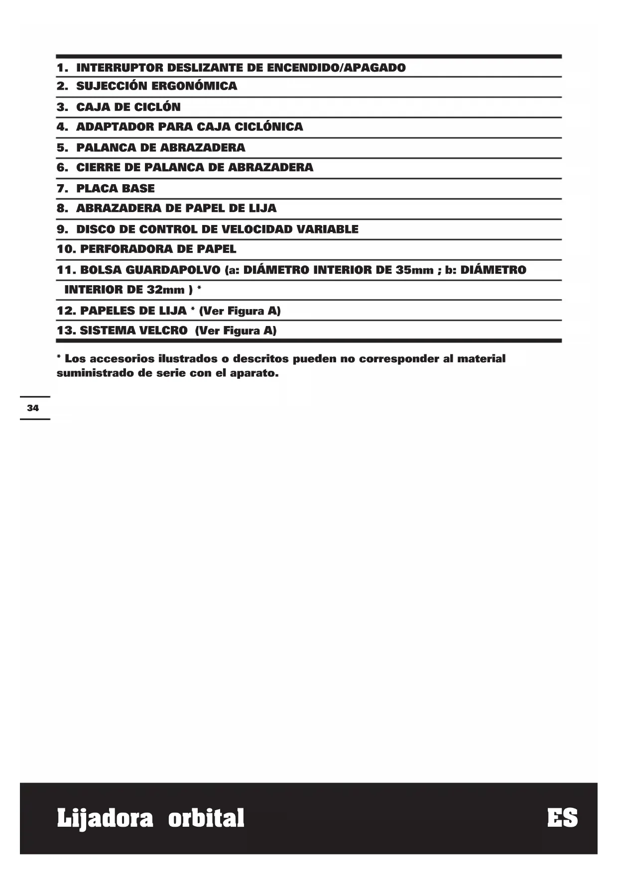 - Los accesorios ilustrados o descritos pueden no corresponder al material suministrado de serie con el aparato.Lijadora orbital ES
