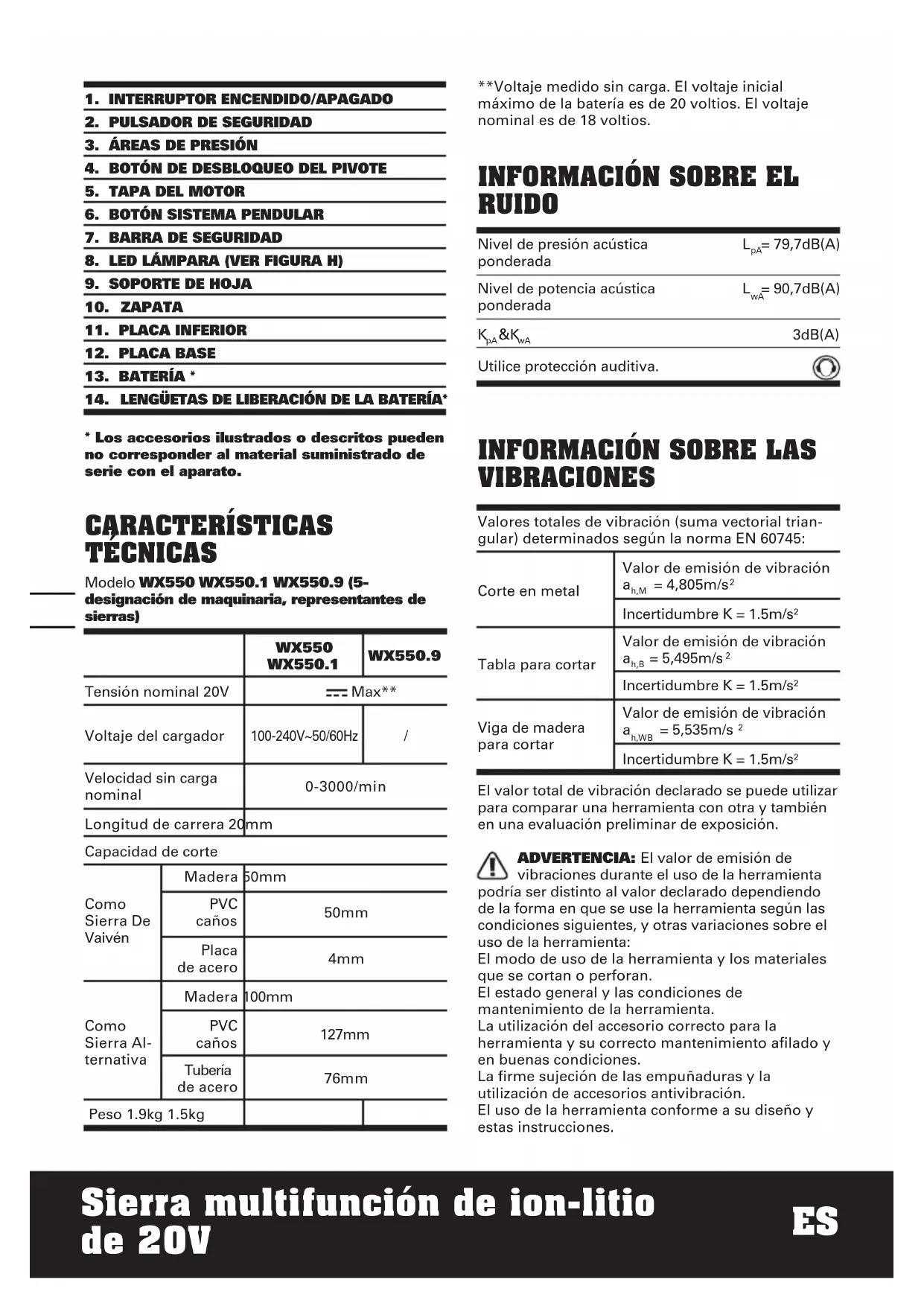 - Los accesorios ilustrados o descritos pueden no corresponder al material suministrado de serie con el aparato. CARACTERÍSTICAS TÉCNICAS Modelo WX550 WX550.1 WX550.9 (5- designación de maquinaria, representantes de sierras) WX550 WX550.1 WX550.9 Tensión nominal 20V Max** Voltaje del cargador 100-240V~50/60Hz