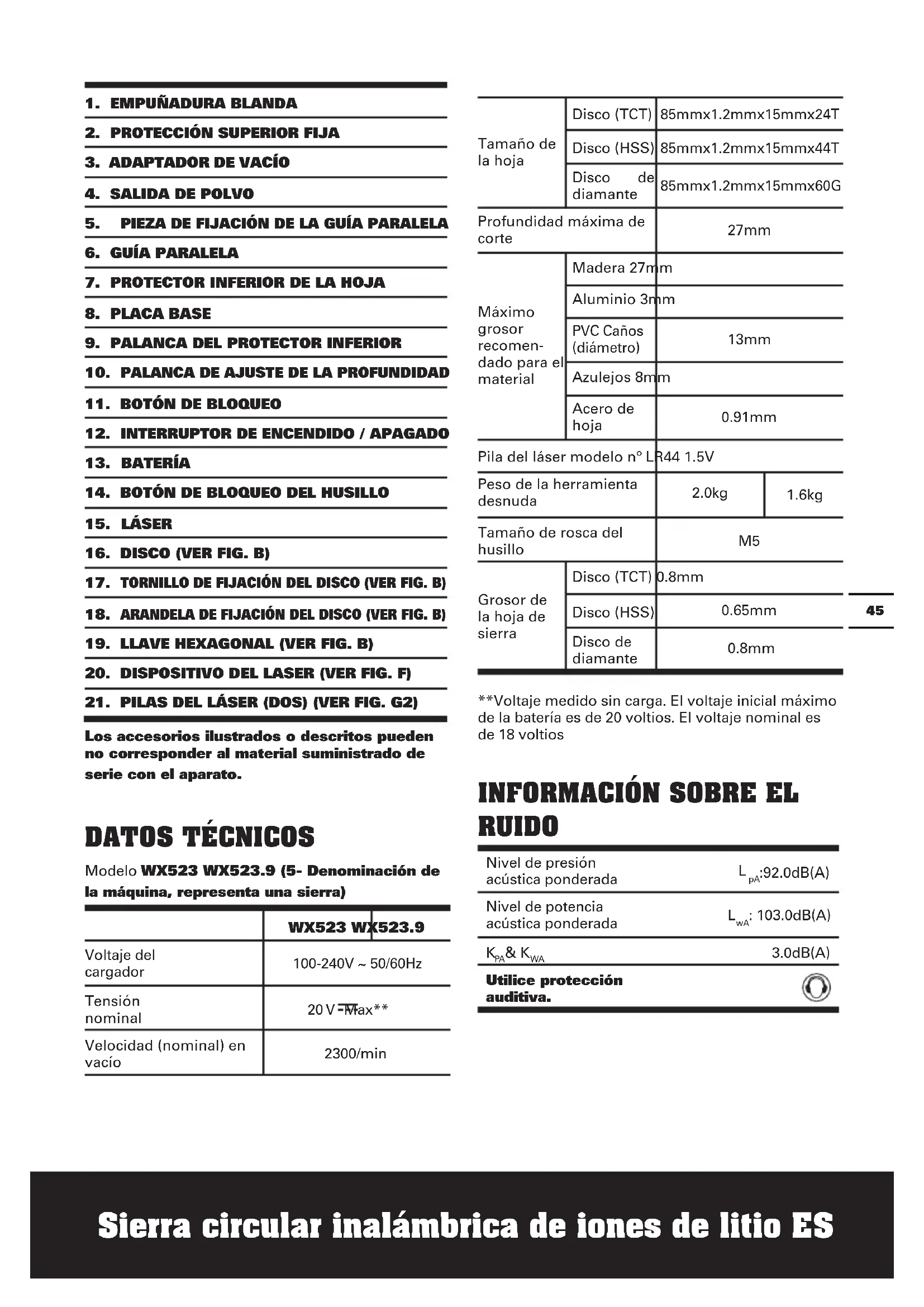 Modelo WX523 WX523.9 (5- Denominación de la máquina, representa una sierra) WX523 WX523.9 Voltaje del cargador 100-240V ~ 50/60Hz Tensión nominal 20 V Max** Velocidad (nominal) en vacío 2300/min Tamaño de la hoja Disco (TCT) 85mmx1.2mmx15mmx24T Disco (HSS) 85mmx1.2mmx15mmx44T Disco de diamante 85mmx1.2mmx15mmx60G Profundidad máxima de corte 27mm Máximo grosor recomen- dado para el material Madera 27mm Aluminio 3mm PVC Caños (diámetro) 13mm Azulejos 8mm Acero de hoja 0.91mm Pila del láser modelo nº LR44 1.5V Peso de la herramienta desnuda 2.0kg 1.6kg Tamaño de rosca del husillo