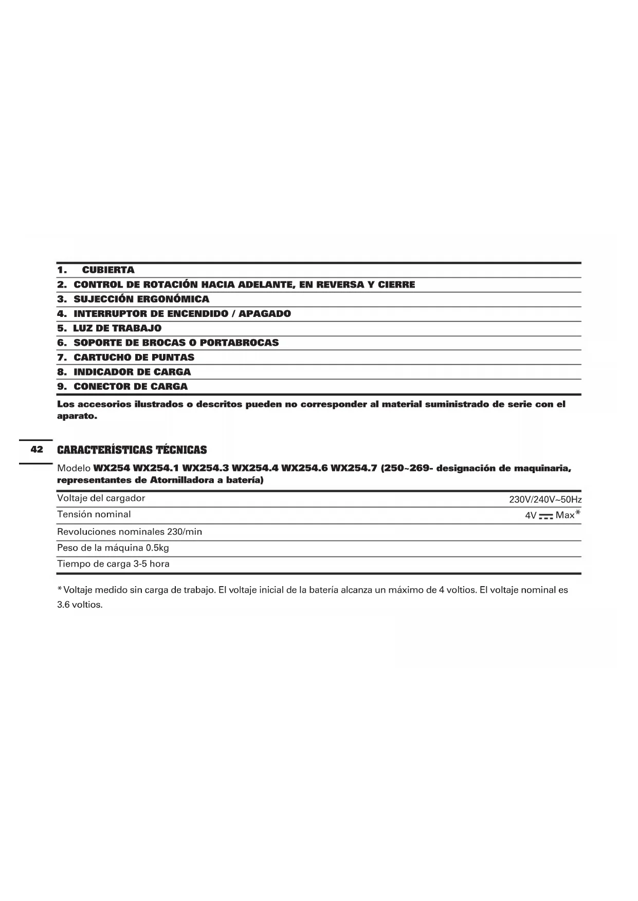 Modelo WX254 WX254.1 WX254.3 WX254.4 WX254.6 WX254.7 (250~269- designación de maquinaria, representantes de Atornilladora a batería) Voltaje del cargador 230V/240V~50Hz Tensión nominal