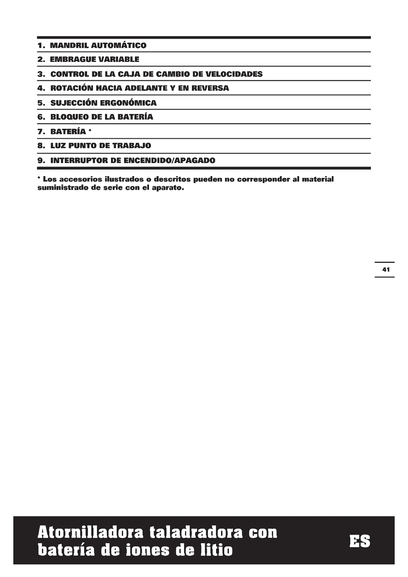 - Los accesorios ilustrados o descritos pueden no corresponder al material suministrado de serie con el aparato.42 Atornilladora taladradora con batería de iones de litio