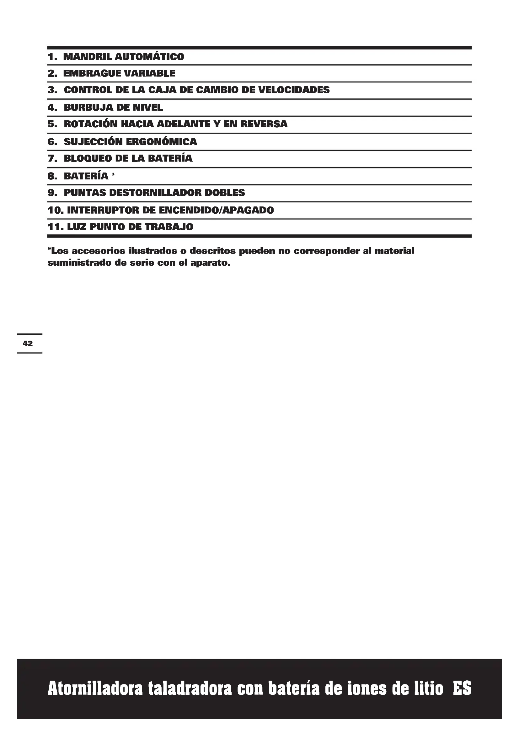 *Los accesorios ilustrados o descritos pueden no corresponder al material suministrado de serie con el aparato.Atornilladora taladradora con batería de iones de litio