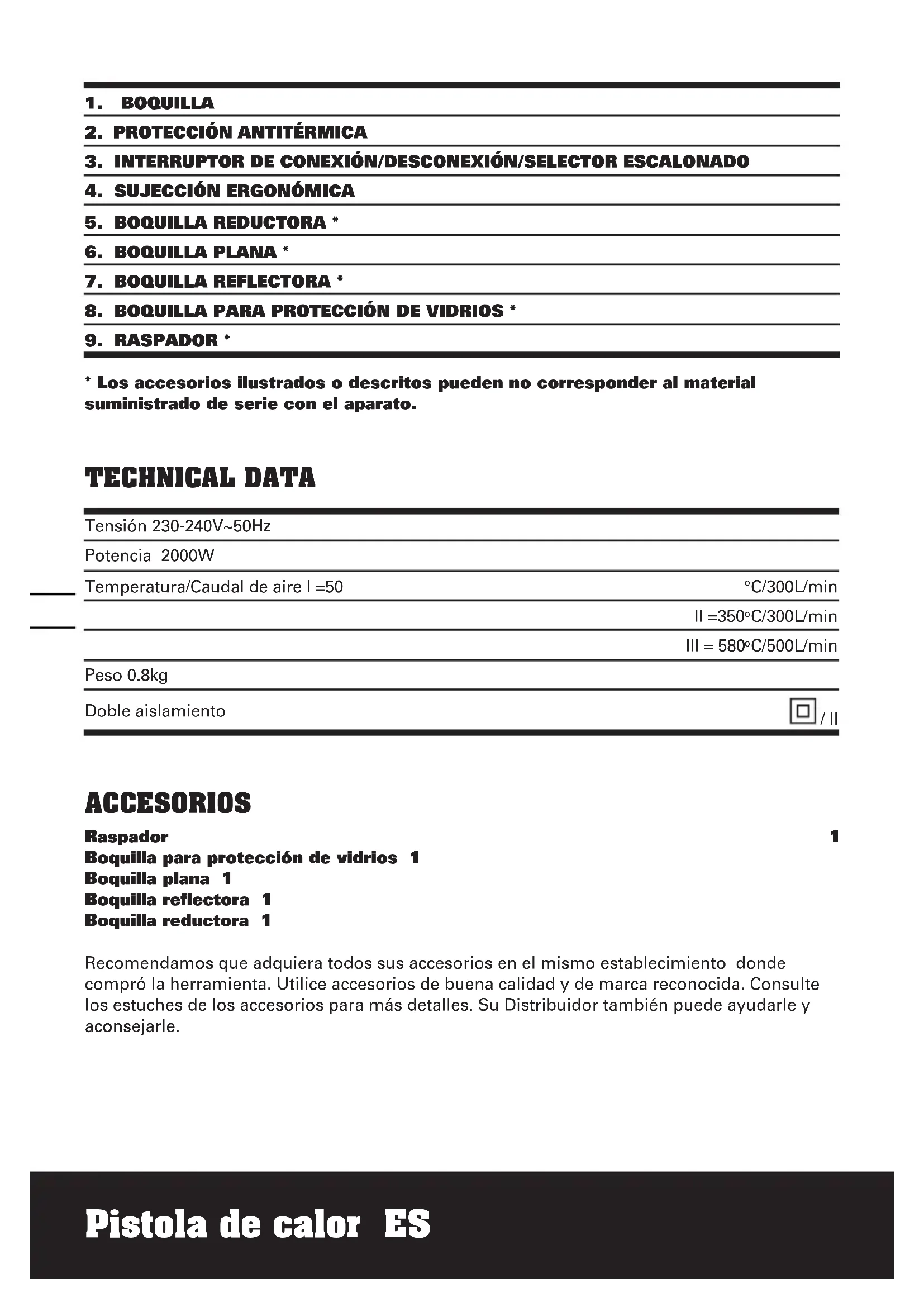 C/500L/min Peso 0.8kg Doble aislamiento / II ACCESORIOS Raspador 1 Boquilla para protección de vidrios 1 Boquilla plana 1 Boquilla reflectora 1 Boquilla reductora 1 Recomendamos que adquiera todos sus accesorios en el mismo establecimiento donde compró la herramienta. Utilice accesorios de buena calidad y de marca reconocida. Consulte los estuches de los accesorios para más detalles. Su Distribuidor también puede ayudarle y aconsejarle.Pistola de calor ES