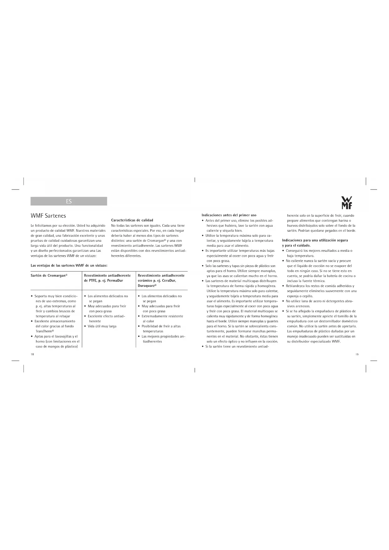 17WMF Sartenes Le felicitamos por su elección. Usted ha adquirido un producto de calidad WMF. Nuestros materiales de gran calidad, una fabricación excelente y unas pruebas de calidad cuidadosas garantizan una larga vida útil del producto. Una funcionalidad y un diseño perfeccionados garantizan una Las ventajas de las sartenes WMF de un vistazo: Características de calidad No todas las sartenes son iguales. Cada una tiene características especiales. Por eso, en cada hogar debería haber al menos dos tipos de sartenes distintos: una sartén de Cromargan® y una con revestimiento antiadherente. Las sartenes WMF están disponibles con dos revestimientos antiad- herentes diferentes. Indicaciones antes del primer uso