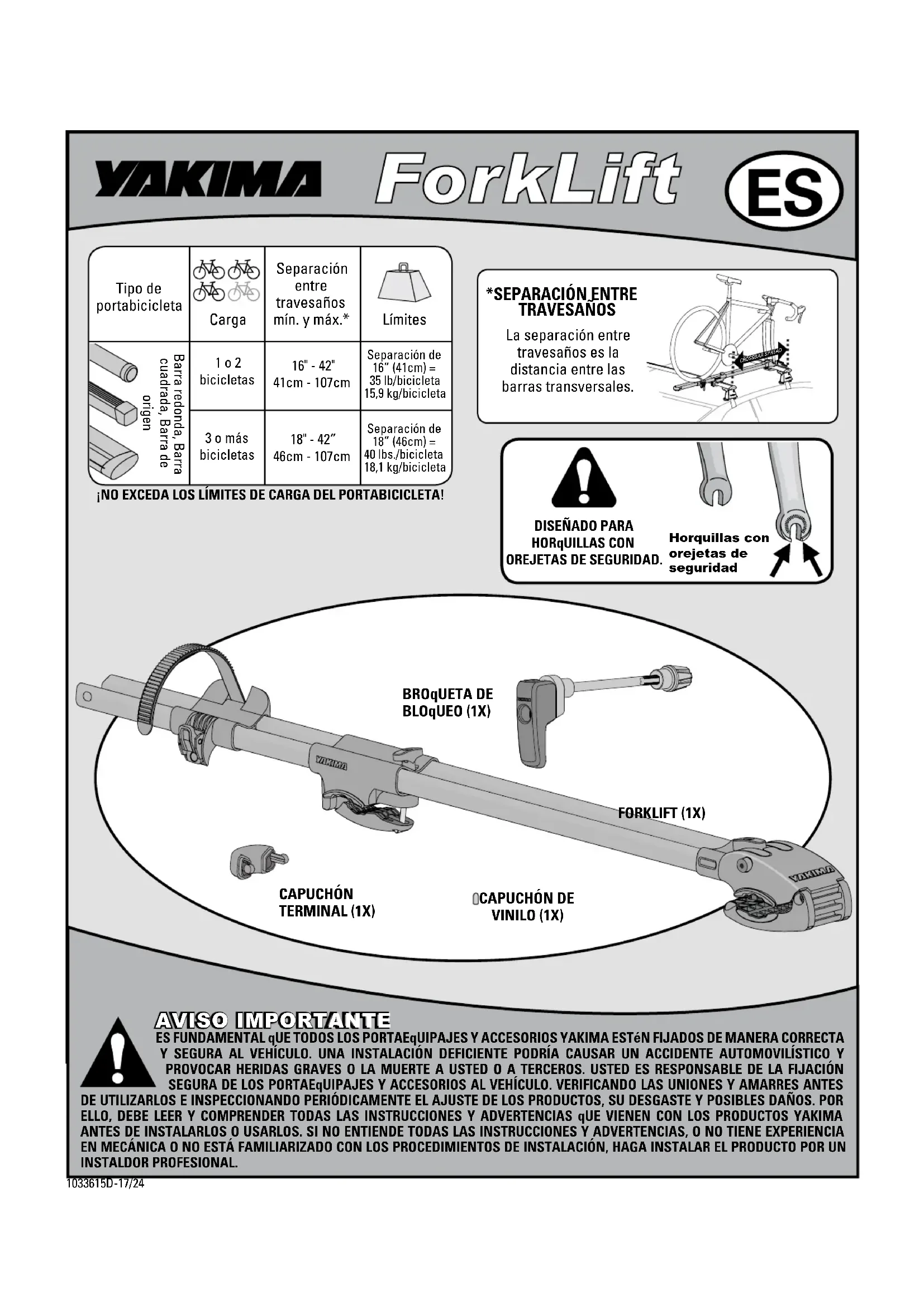 VINILO (1X) AVISO IMPORTANTE ES FUNDAMENTAL qUE TODOS LOS PORTAEqUIPAJES Y ACCESORIOS YAKIMA ESTéN FIJADOS DE MANERA CORRECTA Y SEGURA AL VEHÍCULO. UNA INSTALACIÓN DEFICIENTE PODRÍA CAUSAR UN ACCIDENTE AUTOMOVILÍSTICO Y PROVOCAR HERIDAS GRAVES O LA MUERTE A USTED O A TERCEROS. USTED ES RESPONSABLE DE LA FIJACIÓN SEGURA DE LOS PORTAEqUIPAJES Y ACCESORIOS AL VEHÍCULO. VERIFICANDO LAS UNIONES Y AMARRES ANTES DE UTILIZARLOS E INSPECCIONANDO PERIÓDICAMENTE EL AJUSTE DE LOS PRODUCTOS, SU DESGASTE Y POSIBLES DAÑOS. POR ELLO, DEBE LEER Y COMPRENDER TODAS LAS INSTRUCCIONES Y ADVERTENCIAS qUE VIENEN CON LOS PRODUCTOS YAKIMA ANTES DE INSTALARLOS O USARLOS. SI NO ENTIENDE TODAS LAS INSTRUCCIONES Y ADVERTENCIAS, O NO TIENE EXPERIENCIA EN MECÁNICA O NO ESTÁ FAMILIARIZADO CON LOS PROCEDIMIENTOS DE INSTALACIÓN, HAGA INSTALAR EL PRODUCTO POR UN INSTALDOR PROFESIONAL. Barra redonda, Barra cuadrada, Barra de origen Carga Separación entre travesaños mín. y máx.* 16" - 42" 41cm - 107cm 18" - 42” 46cm - 107cm Separación de16” (41cm) =35 lb/bicicleta15,9 kg/bicicletaSeparación de18” (46cm) =40 lbs./bicicleta18,1 kg/bicicleta 1 o 2 bicicletas 3 o más bicicletas Límites Tipo de portabicicleta ¡NO EXCEDA LOS LÍMITES DE CARGA DEL PORTABICICLETA! CROSSBAR SPREAD