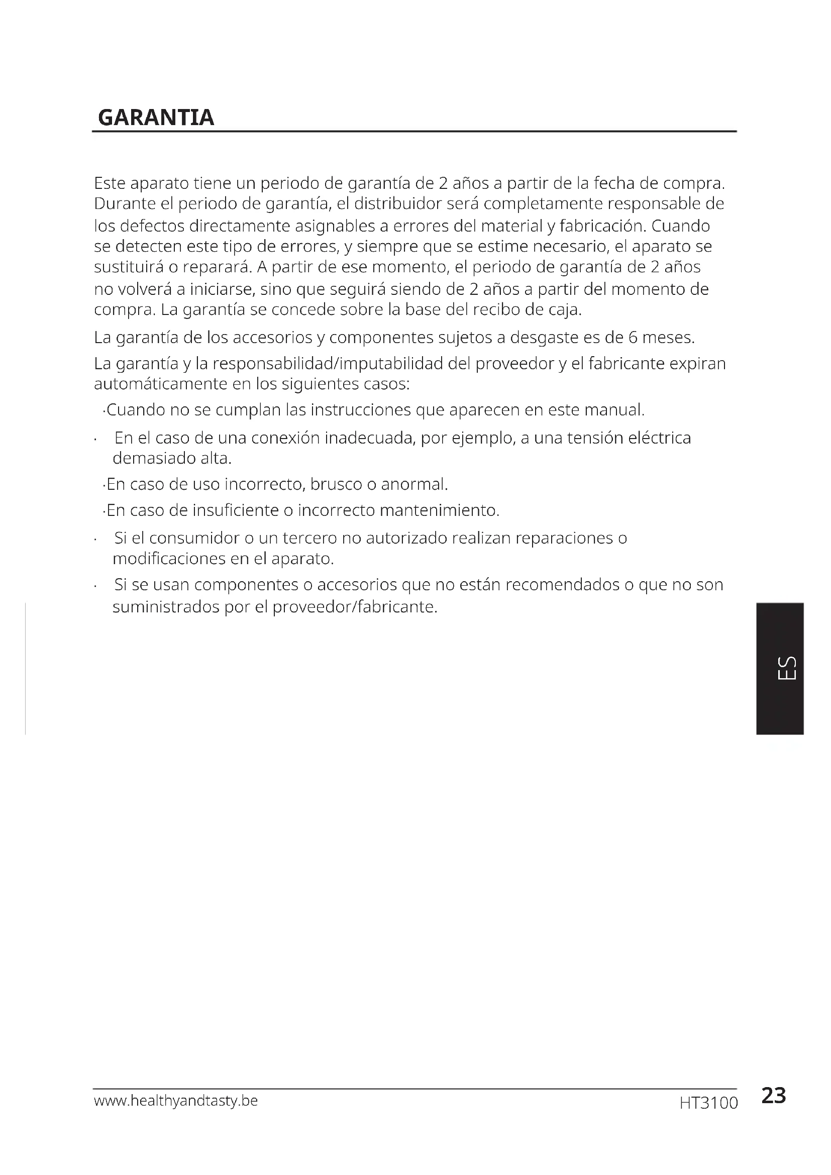 Este aparato tiene un periodo de garantía de 2 años a partir de la Fecha de compra. Durante el periodo de garantía, el distribuidor está Completely responsable de los defectos directamente asignables a errors del material y fabricación. Cuando se detecten este tipo de errors, y siempre que se estime Neededo, el aparato se sustituirá o reparará. A partir de este momento, el periodo de garantía de 2 años no volverá a iniziarse, sino que seguirá cuando de 2 años a partir del momento de compra. La garantía se concede sobre la base del recibo de caja.