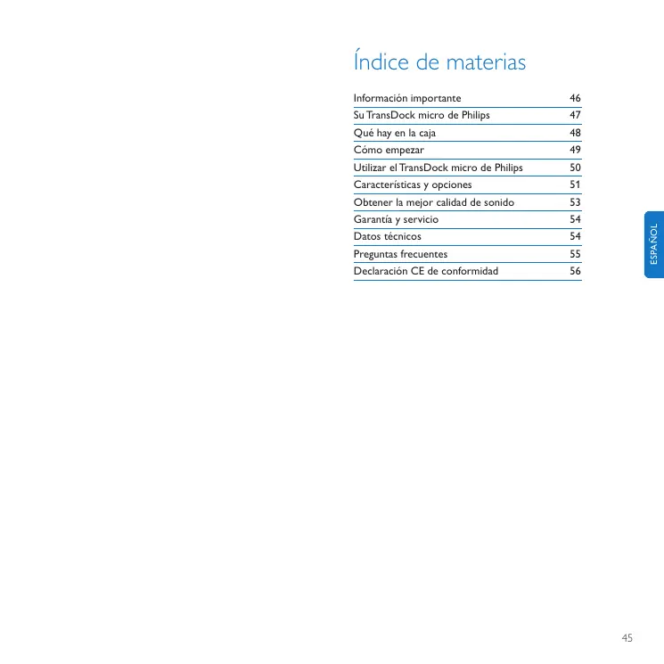 Su TransDock micro de Philips Cómo empezar Características y opciones Garantía y servicio Preguntas frecuentes Declaración CE de conformidad