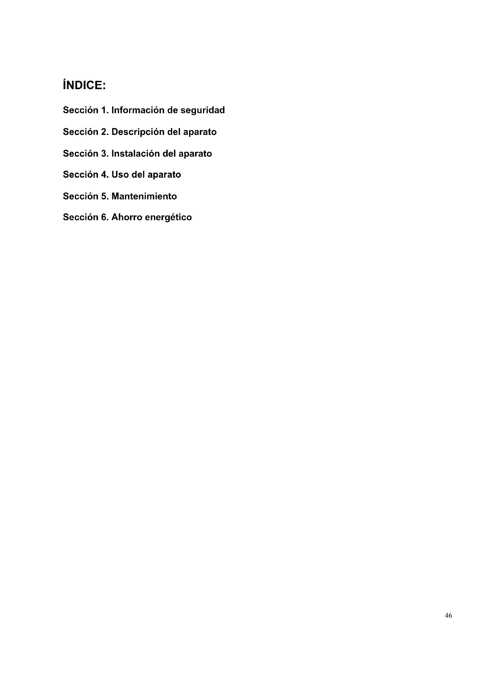 Cet appareil est marqué conformément à la Directive Européenne 2012/19/CE relative aux déchets d'équipements électriques et électroniques (DEEE). Les DEEE contiennent à la fois des substances polluantes (qui peuvent avoir des conséquences négatives sur l'environnement) et des composants de base (qui peuvent être ré-utilisés). Il est important que les DEEE soient soumis à des traitements spécifiques afin de retirer et d'éliminer tous les polluants de manière appropriée et de valoriser et recycler tous les matériaux. Chaque personne individuelle peut jouer un rôle important en s'assurant que les DEEE ne deviennent pas un problème environnemental ; il est essentiel de suivre certaines lois fondamentales : les DEEE ne doivent pas être traités comme des déchets ménagers. les DEEE doivent être remis aux points de collecte appropriés, gérés par les municipalités ou des entreprises agréées. Dans de nombreux pays, en cas de DEEE de grande taille, la collecte à domicile peut être à disposition. Dans de nombreux pays, lorsque vous achetez un nouvel appareil, l'ancien peut être retourné au vendeur qui doit le collecter gratuitement sous forme d'échange, dans la mesure où l'équipent est d'un type équivalent et qu'il possède les mêmes fonctions que l'équipement fourni. Conformité En apposant la marque sur ce produit, nous confirmons qu’il est conforme à toutes les exigences européennes en matière de sécurité, de santé et d’environnement qui sont applicables dans la législation pour ce produit.46 ÍNDICE: Sección 1. Información de seguridad Sección 2. Descripción del aparato Sección 3. Instalación del aparato Sección 4. Uso del aparato Sección 5. Mantenimiento Sección 6. Ahorro energético47 Gracias por haber adquirido este producto. Antes de utilizar el frigorífico, le aconsejamos que lea atentamente este manual de instrucciones para maximizar su rendimiento. Guarde toda la documentación para consultas o propietarios futuros. Este producto deberá destinarse únicamente a usos domésticos u otras aplicaciones similares, como: - el área de cocina para personal en tiendas, oficinas y otros entornos de trabajo, - en casas de campo o por clientes de hoteles, moteles y otros entornos de tipo residencial, - en establecimientos bed and breakfasts (B&B), - para servicios de catering y usos similares no destinados a la venta al por menor. Este aparato deberá ser destinado única y exclusivamente a la conservación de alimentos. Cualquier otro uso se considera peligroso y el fabricante no podrá ser considerado responsable de cualquier omisión. Asimismo, se recomienda leer las condiciones de garantía. Es importante leer atentamente estas instrucciones para conseguir el máximo rendimiento y un funcionamiento óptimo de su electrodoméstico. No respetar estas instrucciones podría dejar sin validez su derecho a acceder al servicio técnico gratuito durante el período de garantía.48 Sección 1. INFORMACIÓN DE SEGURIDAD Esta guía puede contener información de seguridad importante. Le sugerimos guardar estas instrucciones en un lugar seguro para poder consultarlas en el futuro y garantizar que tenga una buena experiencia con el electrodoméstico. El congelador contiene un gas refrigerante (R600a: isobutano) y gas aislante (ciclopentano) que, aunque poseen una elevada compatibilidad con el medio ambiente, son inflamables. Precaución: riesgo de incendio En caso de producirse daños en el circuito de refrigerante: Evite llamas desnudas y fuentes de ignición. Ventile a fondo la estancia donde se encuentre situado el electrodoméstico. Tiempo de funcionamiento proporcional:onamiento 30 min, parado 15 min PRECAUCIÓN Durante la limpieza y el transporte, deberá tener cuidado de no tocar los cables metálicos del condensador en la parte posterior del electrodoméstico, puesto que podría lesionarse los dedos y las manos o dañar el producto.