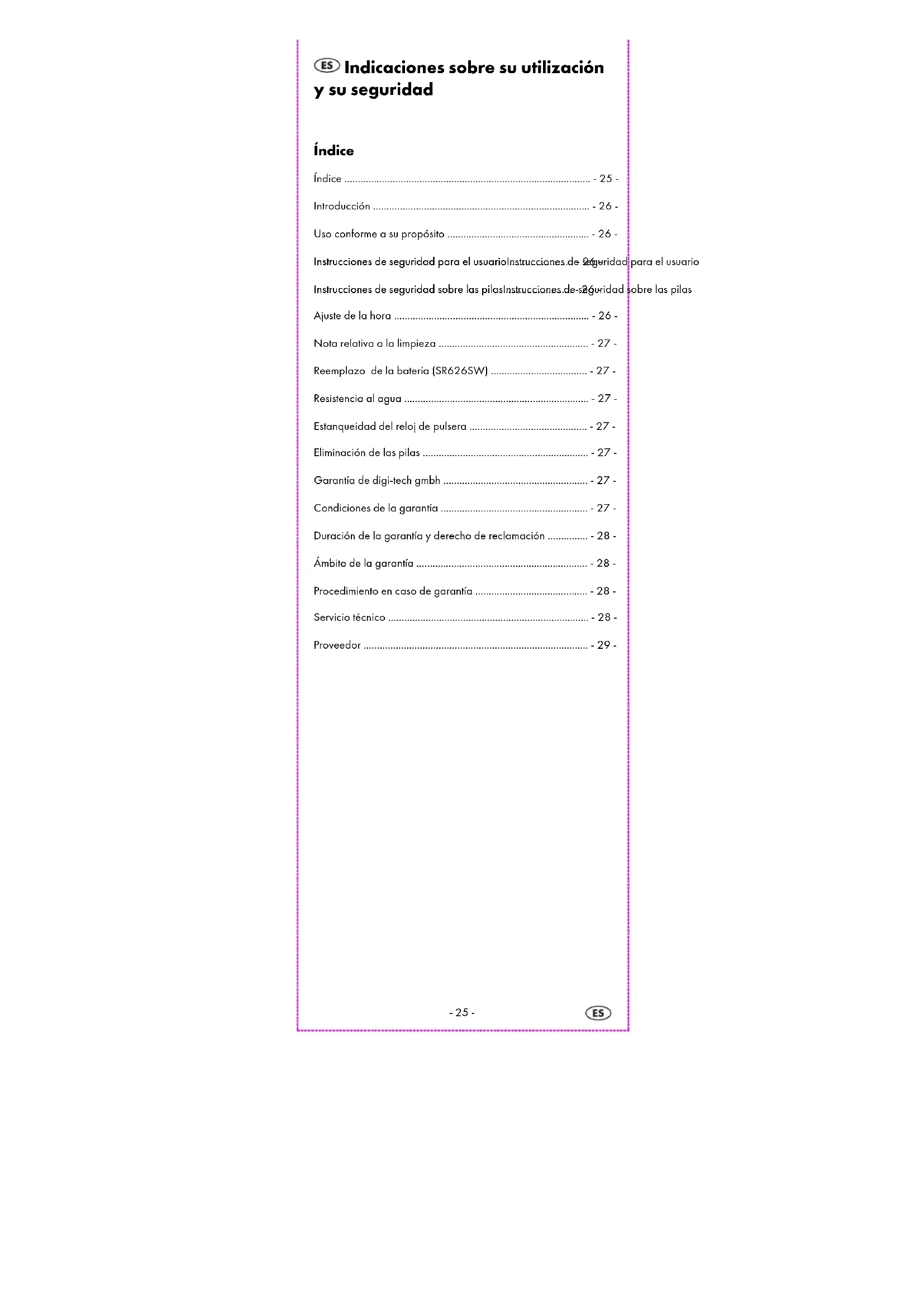 Indicaciones sobre su utilización y su seguridad Índice Índice ............................................................................................ - 25 - Introducción ................................................................................. - 26 - Uso conforme a su propósito ..................................................... - 26 - Instrucciones de seguridad para el usuario Instrucciones de seguridad para el usuarioInstrucciones de seguridad para el usuario Instrucciones de seguridad para el usuario ........................ - 26 - Instrucciones de seguridad sobre las pilas Instrucciones de seguridad sobre las pilasInstrucciones de seguridad sobre las pilas Instrucciones de seguridad sobre las pilas.......................... - 26 - Ajuste de la hora ......................................................................... - 26 - Nota relativa a la limpieza ........................................................ - 27 - Reemplazo de la batería (SR626SW) .................................... - 27 - Resistencia al agua ..................................................................... - 27 - Estanqueidad del reloj de pulsera ............................................ - 27 - Eliminación de las pilas .............................................................. - 27 - Garantía de digi-tech gmbh ...................................................... - 27 - Condiciones de la garantía ....................................................... - 27 - Duración de la garantía y derecho de reclamación ............... - 28 - Ámbito de la garantía ................................................................ - 28 - Procedimiento en caso de garantía .......................................... - 28 - Servicio técnico ........................................................................... - 28 - Proveedor .................................................................................... - 29 --