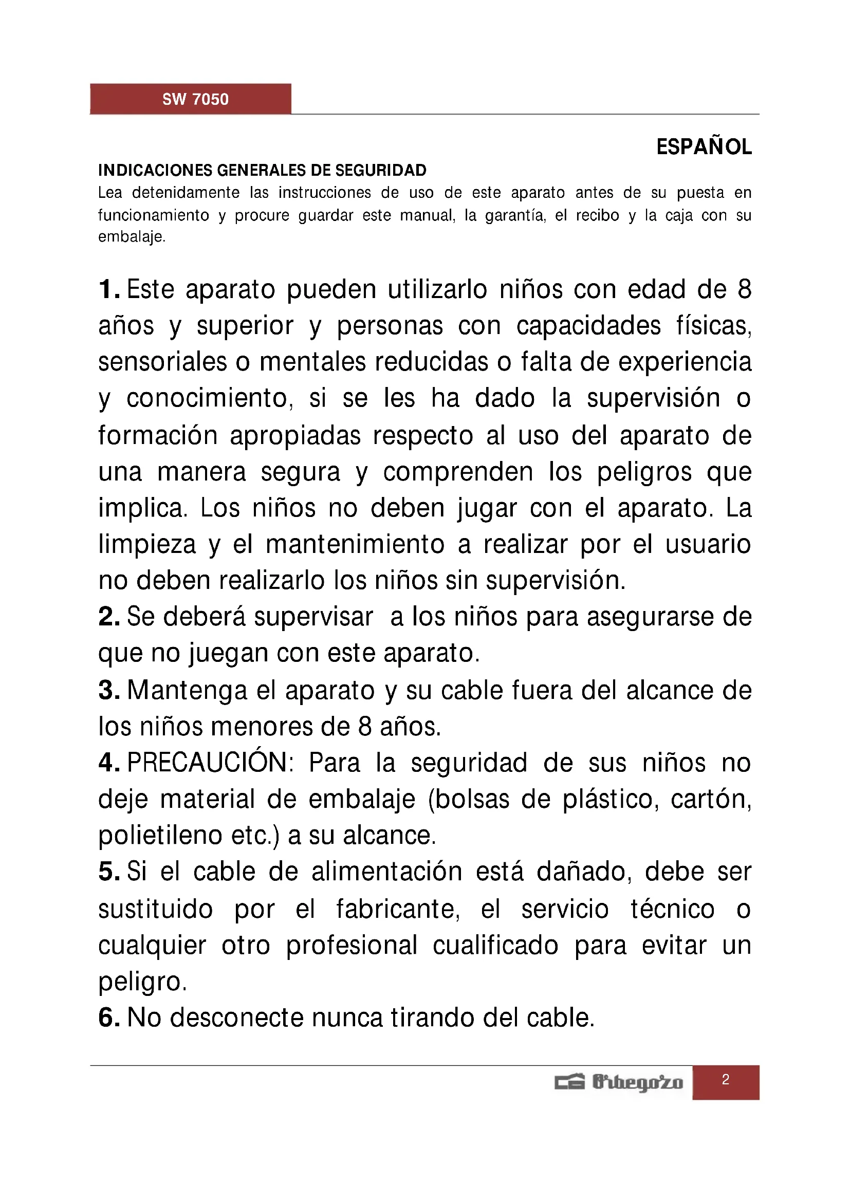 Encuentra gratis el manual del aparato SW 7050 Orbegozo en formato PDF.