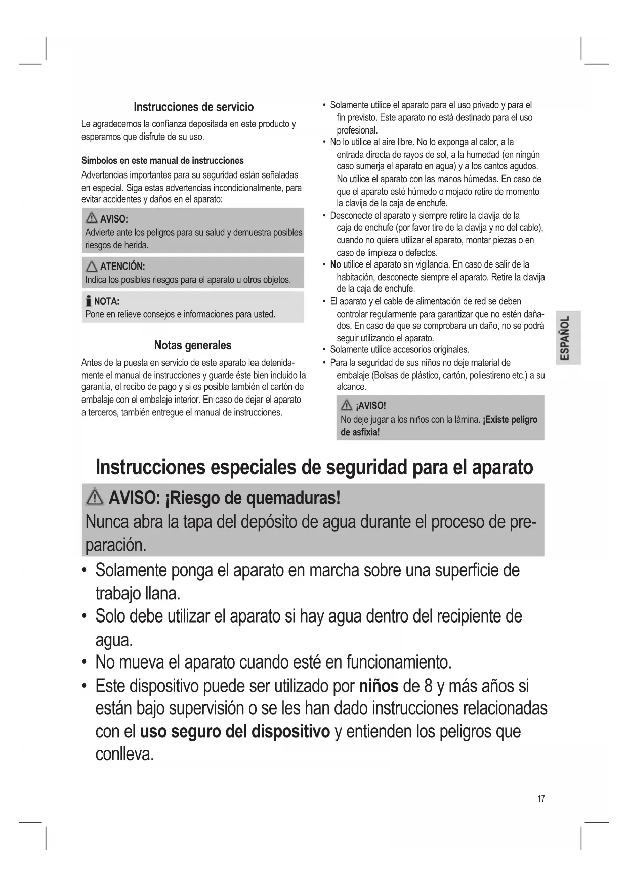 - Para la seguridad de sus niños no deje material de embalaje (Bolsas de plástico, cartón, poliestireno etc.) a su alcance. ¡AVISO! No deje jugar a los niños con la lámina. ¡Existe peligro de asxia! Instrucciones de servicio Le agradecemos la conanza depositada en este producto y esperamos que disfrute de su uso. Símbolos en este manual de instrucciones Advertencias importantes para su seguridad están señaladas en especial. Siga estas advertencias incondicionalmente, para evitar accidentes y daños en el aparato: AVISO: Advierte ante los peligros para su salud y demuestra posibles riesgos de herida. ATENCIÓN: Indica los posibles riesgos para el aparato u otros objetos. NOTA: Pone en relieve consejos e informaciones para usted. Notas generales Antes de la puesta en servicio de este aparato lea detenida- mente el manual de instrucciones y guarde éste bien incluido la garantía, el recibo de pago y si es posible también el cartón de embalaje con el embalaje interior. En caso de dejar el aparato a terceros, también entregue el manual de instrucciones. Instrucciones especiales de seguridad para el aparato AVISO: ¡Riesgo de quemaduras! Nunca abra la tapa del depósito de agua durante el proceso de pre- paración.