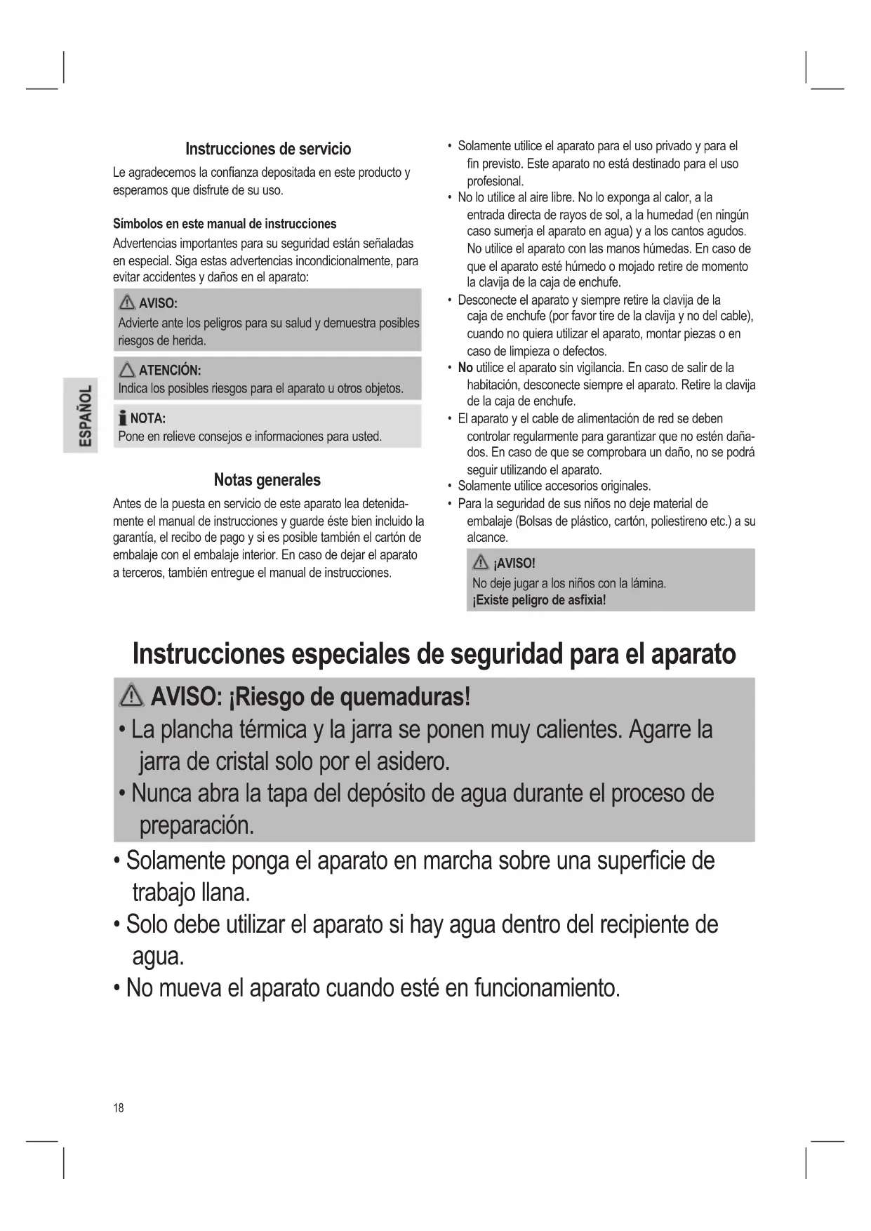 - Para la seguridad de sus niños no deje material de embalaje (Bolsas de plástico, cartón, poliestireno etc.) a su alcance. ¡AVISO! No deje jugar a los niños con la lámina. ¡Existe peligro de asxia! Instrucciones de servicio Le agradecemos la conanza depositada en este producto y esperamos que disfrute de su uso. Símbolos en este manual de instrucciones Advertencias importantes para su seguridad están señaladas en especial. Siga estas advertencias incondicionalmente, para evitar accidentes y daños en el aparato: AVISO: Advierte ante los peligros para su salud y demuestra posibles riesgos de herida. ATENCIÓN: Indica los posibles riesgos para el aparato u otros objetos. NOTA: Pone en relieve consejos e informaciones para usted. Notas generales Antes de la puesta en servicio de este aparato lea detenida- mente el manual de instrucciones y guarde éste bien incluido la garantía, el recibo de pago y si es posible también el cartón de embalaje con el embalaje interior. En caso de dejar el aparato a terceros, también entregue el manual de instrucciones. Instrucciones especiales de seguridad para el aparato AVISO: ¡Riesgo de quemaduras!
