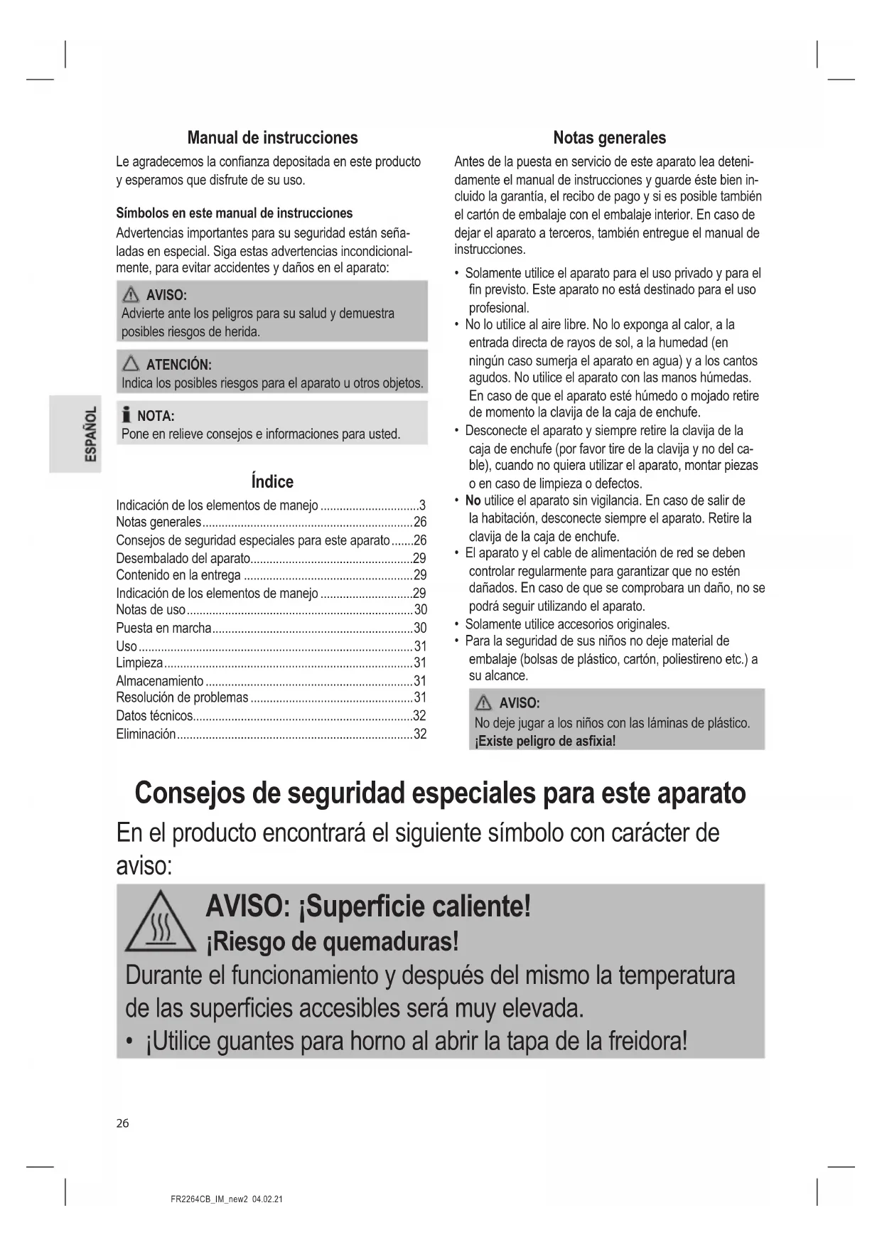 - Manual de instrucciones Le agradecemos la conanza depositada en este producto y esperamos que disfrute de su uso. Símbolos en este manual de instrucciones Advertencias importantes para su seguridad están seña- ladas en especial. Siga estas advertencias incondicional- mente, para evitar accidentes y daños en el aparato: AVISO: Advierte ante los peligros para su salud y demuestra posibles riesgos de herida. ATENCIÓN: Indica los posibles riesgos para el aparato u otros objetos. NOTA: Pone en relieve consejos e informaciones para usted. Índice Indicación de los elementos de manejo p. 3