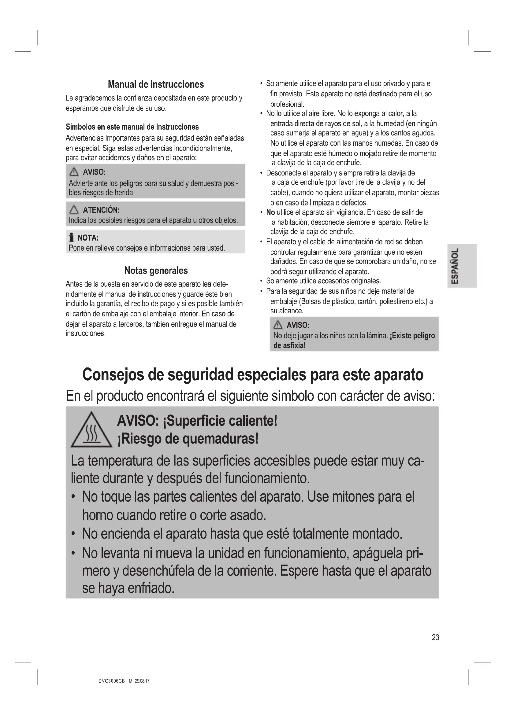 - Para la seguridad de sus niños no deje material de embalaje (Bolsas de plástico, cartón, poliestireno etc.) a su alcance. AVISO: No deje jugar a los niños con la lámina. ¡Existe peligro de asxia! Consejos de seguridad especiales para este aparato En el producto encontrará el siguiente símbolo con carácter de aviso: AVISO: ¡Supercie caliente! ¡Riesgo de quemaduras! La temperatura de las supercies accesibles puede estar muy ca- liente durante y después del funcionamiento.