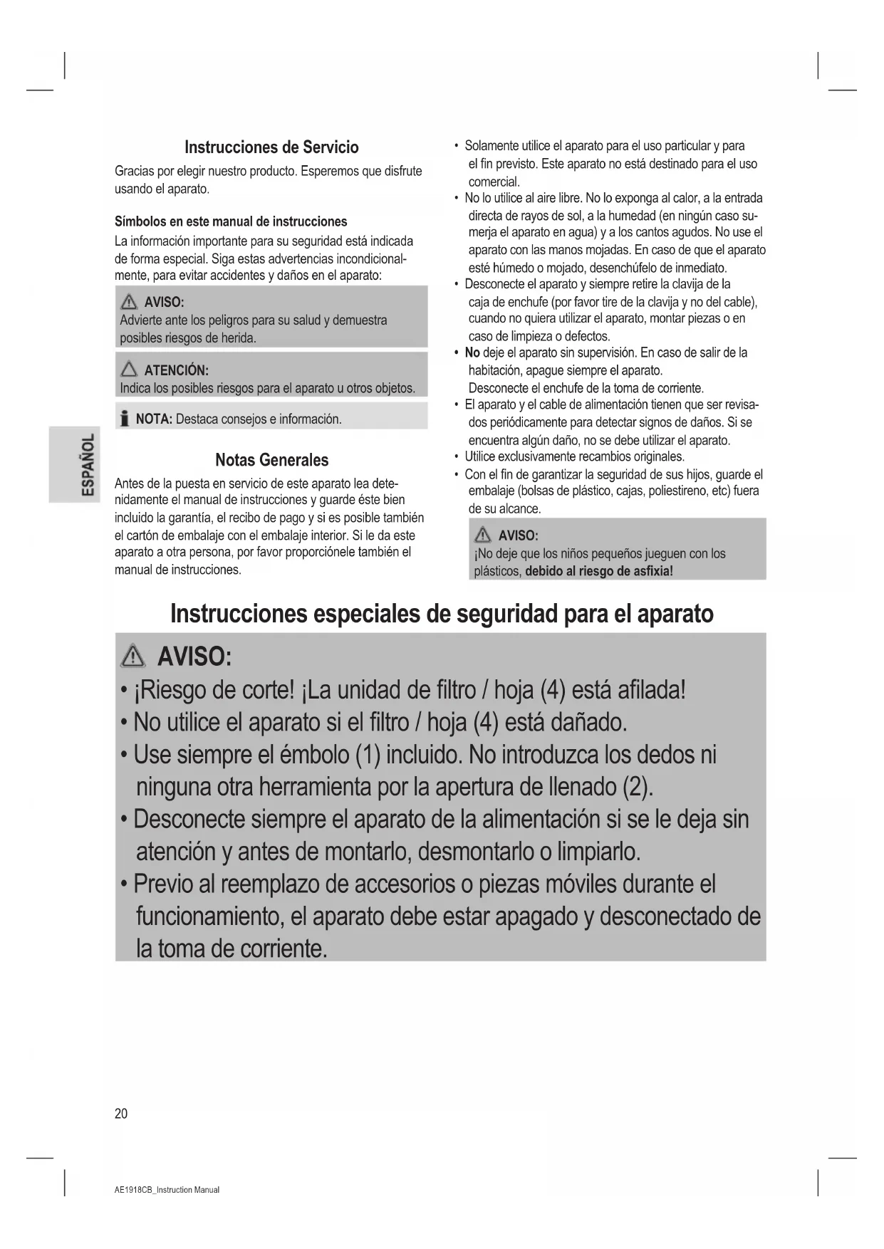 - Previo al reemplazo de accesorios o piezas móviles durante el funcionamiento, el aparato debe estar apagado y desconectado de la toma de corriente.21 AE1918CB_Instruction Manual 26.10.16 AVISO: