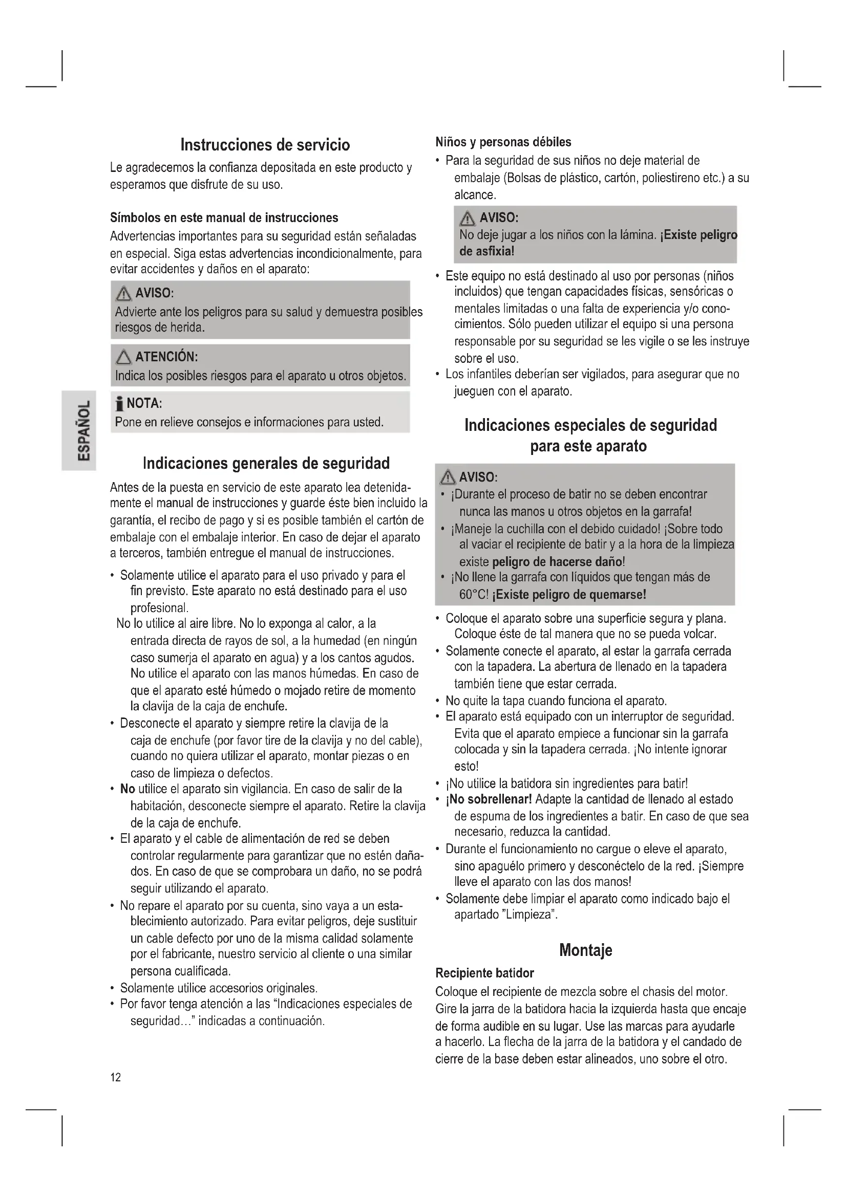 - Solamente debe limpiar el aparato como indicado bajo el apartado ”Limpieza”. Montaje Recipiente batidor Coloque el recipiente de mezcla sobre el chasis del motor. Gire la jarra de la batidora hacia la izquierda hasta que encaje de forma audible en su lugar. Use las marcas para ayudarle a hacerlo. La echa de la jarra de la batidora y el candado de cierre de la base deben estar alineados, uno sobre el otro.13 Tapa Ponga la tapa de forma que el caño quede a la izquierda del asa. Gire la tapa hacia la izquierda hasta que encaje de forma audible en su lugar. Use las marcas para ayudarle a hacerlo. La echa de la tapa y el asa de la jarra de la batidora deben estar alineados, uno sobre el otro. NOTA: En caso de un montaje erróneo se evitará el funcionamiento de la batidora. Notas de utilización