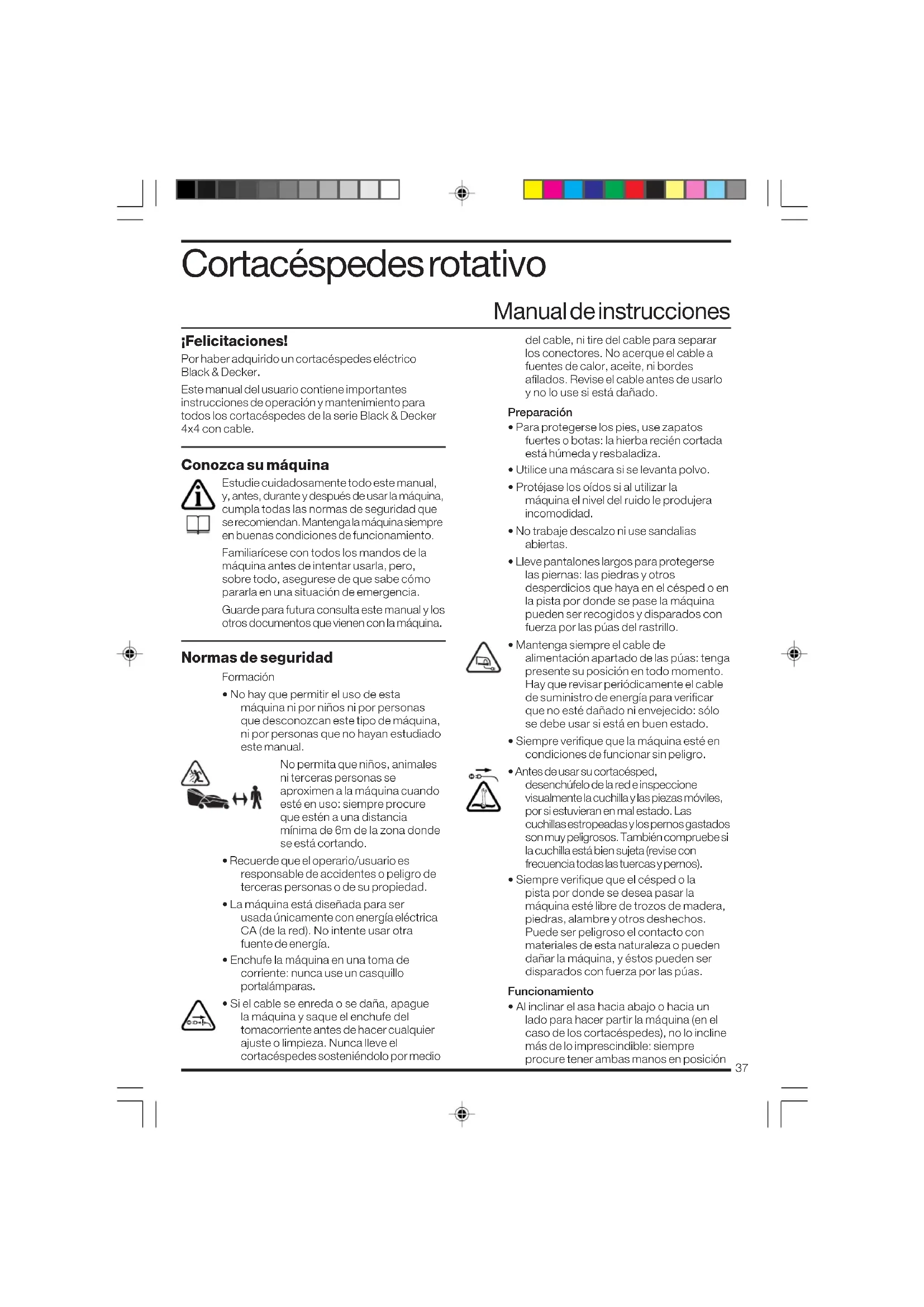 Este manual del usuario contiene importantes instrucciones de operation y mantenimiento para todos los cortacéspedes de la serie Black & Decker 4x4 con cable.