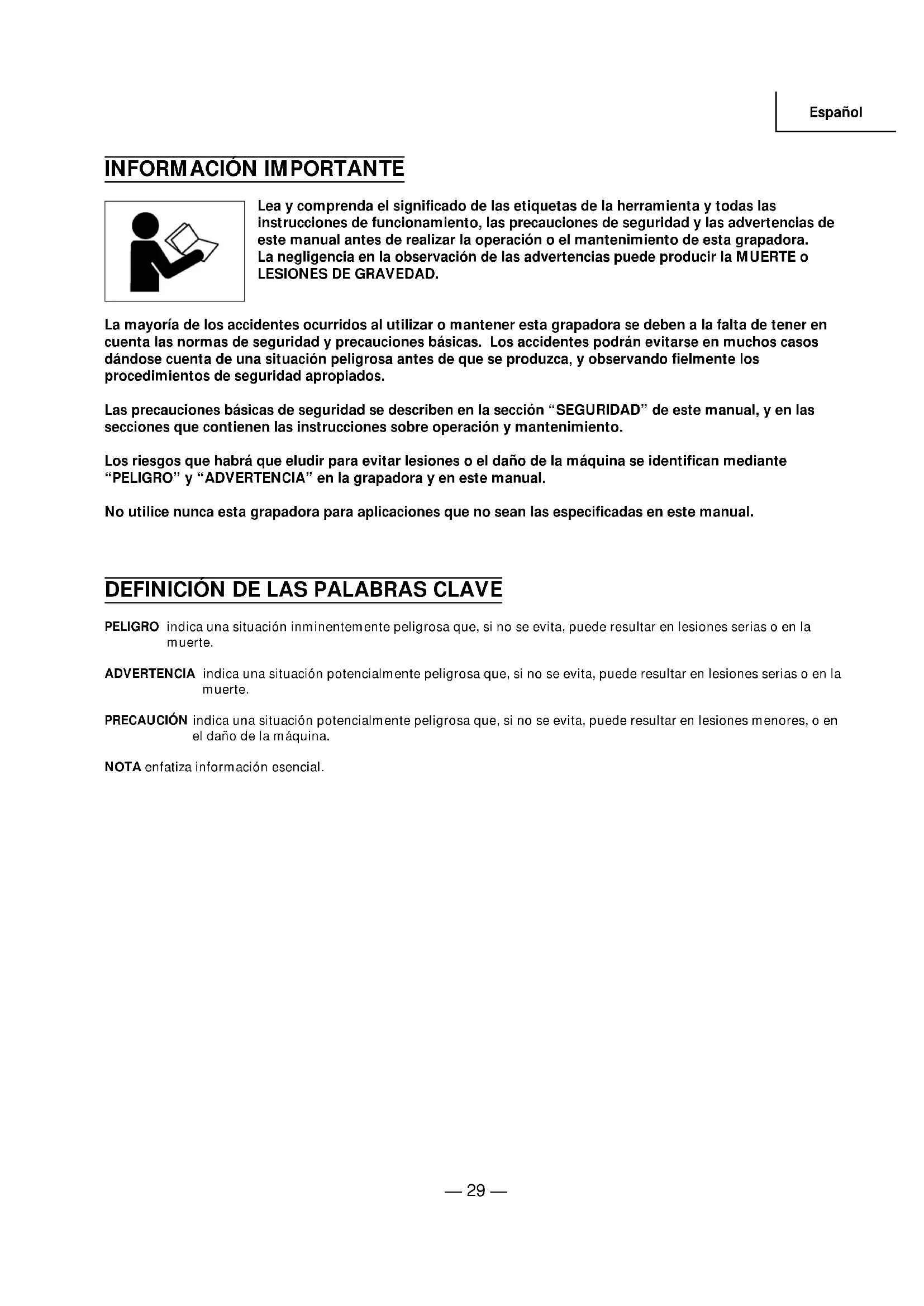Lea y comprenda el significado de las etiquetas de la herramienta y todas las instrucciones de funcionamiento, las precauciones de seguridad y las advertencias de este manual antes de realizar la operación o el mantenimiento de esta grapadora. La negligencia en la observación de las advertencias puede producir la MUERTE o LESIONES DE GRAVEDAD. La mayoría de los accidentes ocurridos al utilizar o mantener esta grapadora se deben a la falta de tener en cuenta las normas de seguridad y precauciones básicas. Los accidentes podrán evitarse en muchos casos dándose cuenta de una situación peligrosa antes de que se produzca, y observando fielmente los procedimientos de seguridad apropiados. Las precauciones básicas de seguridad se describen en la sección “SEGURIDAD” de este manual, y en las secciones que contienen las instrucciones sobre operación y mantenimiento. Los riesgos que habrá que eludir para evitar lesiones o el daño de la máquina se identifican mediante “PELIGRO” y “ADVERTENCIA” en la grapadora y en este manual. No utilice nunca esta grapadora para aplicaciones que no sean las especificadas en este manual.