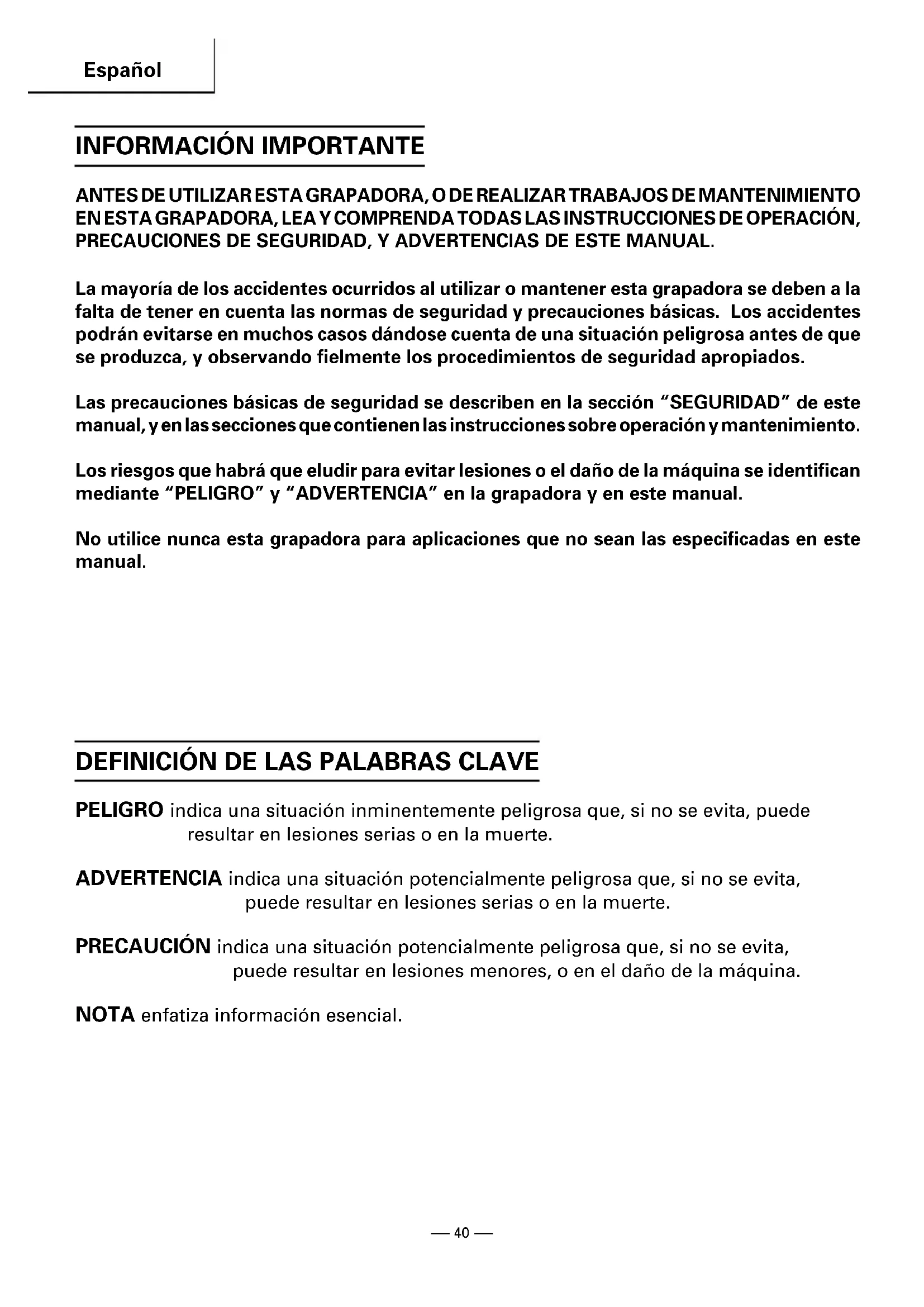 ANTES DE UTILIZAR ESTA GRAPADORA, O DE REALIZAR TRABAJOS DE MANTENIMIENTO EN ESTA GRAPADORA, LEA Y COMPRENDA TODAS LAS INSTRUCCIONES DE OPERACIÓN, PRECAUCIONES DE SEGURIDAD, Y ADVERTENCIAS DE ESTE MANUAL. La mayoría de los accidentes ocurridos al utilizar o mantener esta grapadora se deben a la falta de tener en cuenta las normas de seguridad y precauciones básicas. Los accidentes podrán evitarse en muchos casos dándose cuenta de una situación peligrosa antes de que se produzca, y observando fielmente los procedimientos de seguridad apropiados. Las precauciones básicas de seguridad se describen en la sección “SEGURIDAD” de este manual, y en las secciones que contienen las instrucciones sobre operación y mantenimiento. Los riesgos que habrá que eludir para evitar lesiones o el daño de la máquina se identifican mediante “PELIGRO” y “ADVERTENCIA” en la grapadora y en este manual. No utilice nunca esta grapadora para aplicaciones que no sean las especificadas en este manual.