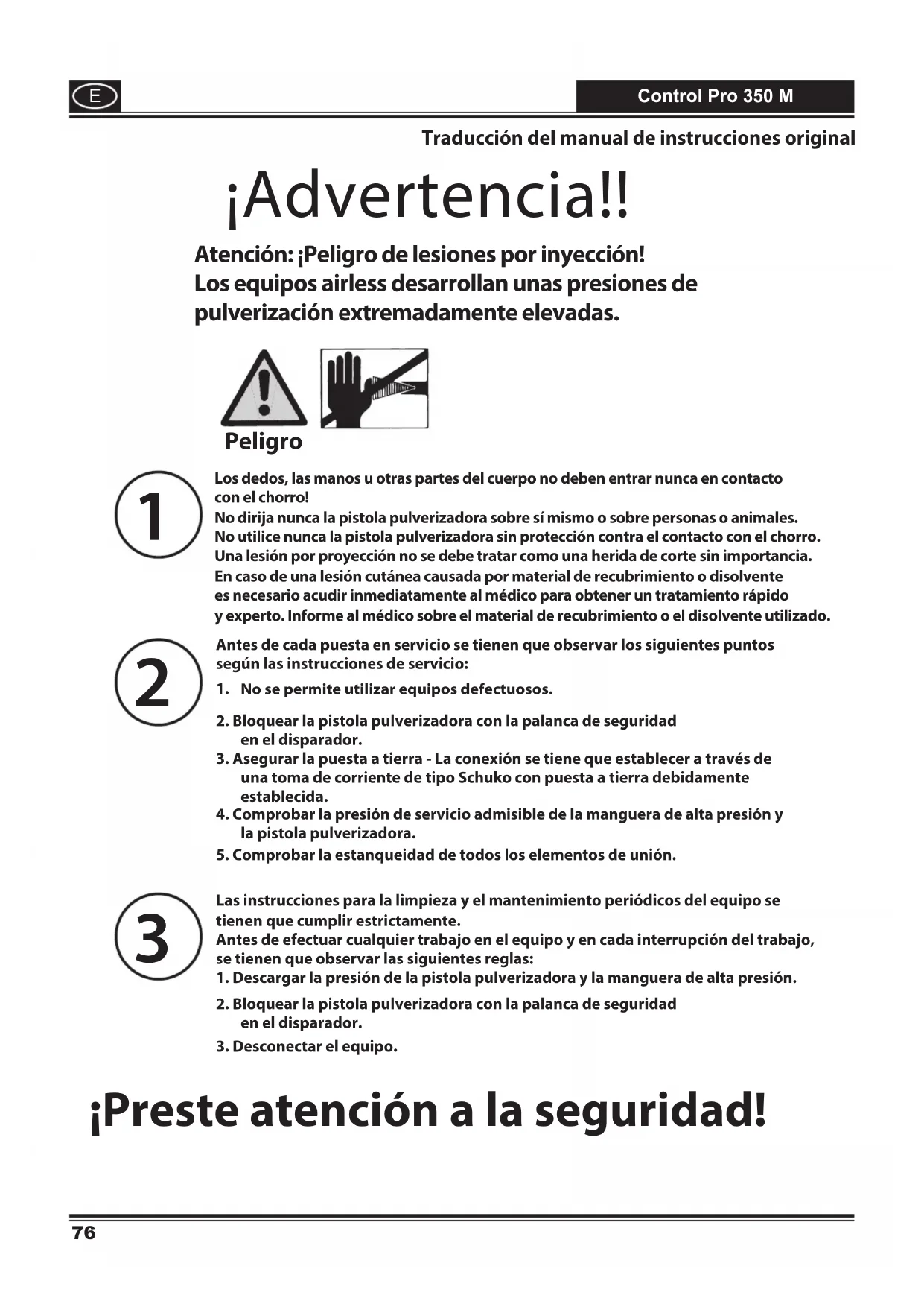 Atencion: Peligro de lesiones por inyeccion! Los equipos airless disparrollanunas presiones de pulverizacion extremamente elevadas.