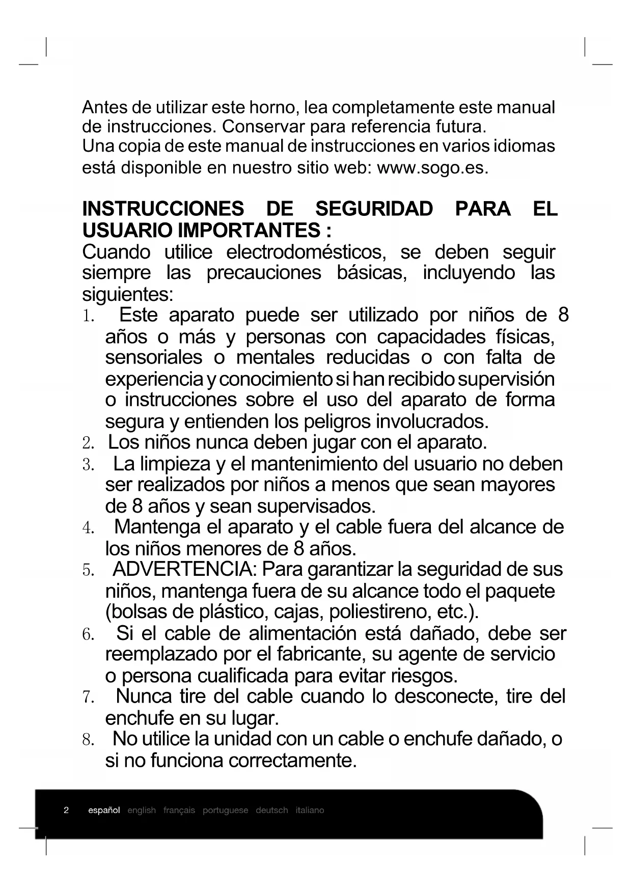 español english français portuguese deutsch italiano sumerja el cable, el enchufe o cualquier parte del horno en agua o cualquier otro líquido.