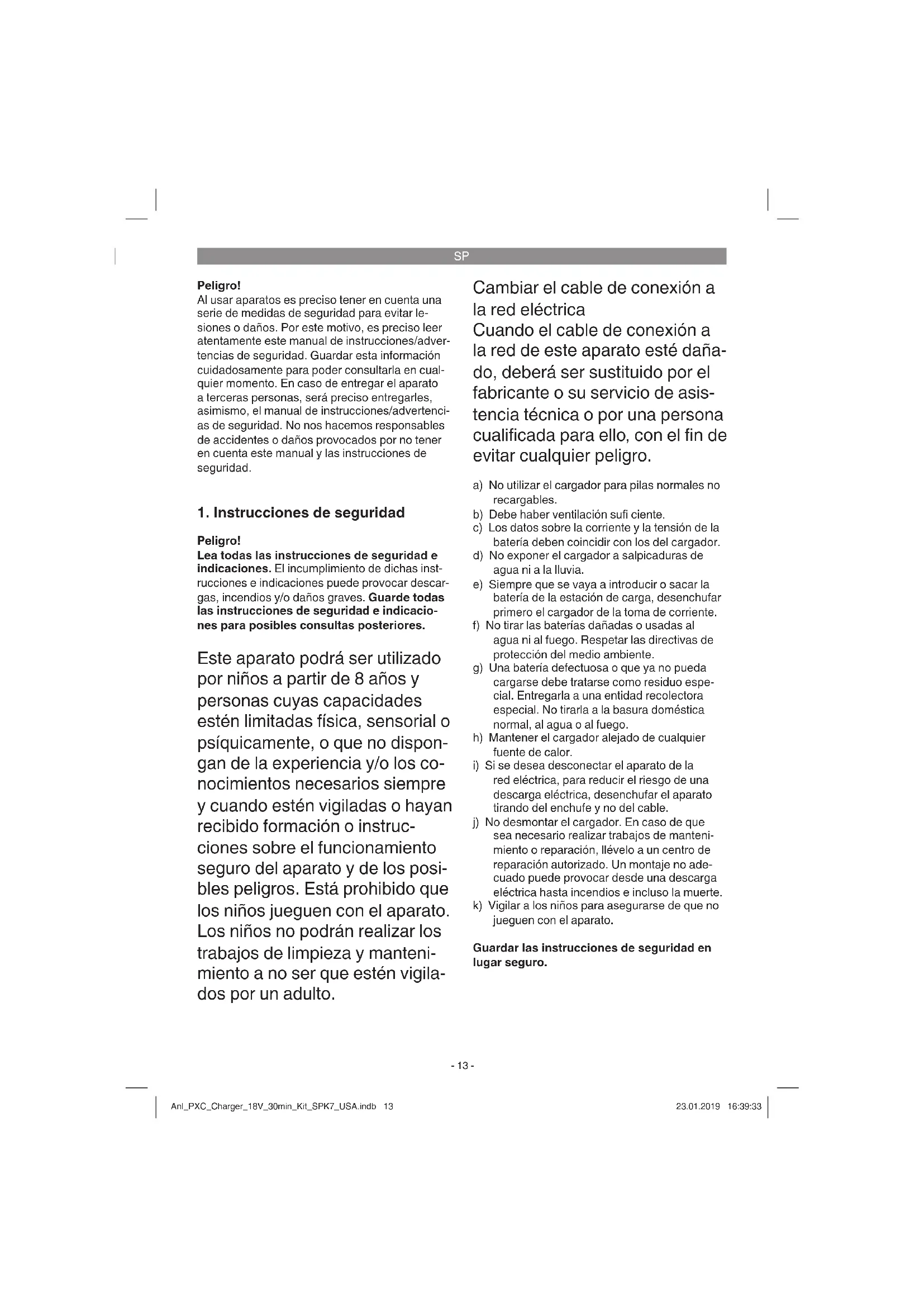 red eléctrica, para reducir el riesgo de una descarga eléctrica, desenchufar el aparato tirando del enchufe y no del cable. j) No desmontar el cargador. En caso de que sea necesario realizar trabajos de manteni- miento o reparación, llévelo a un centro de reparación autorizado. Un montaje no ade- cuado puede provocar desde una descarga eléctrica hasta incendios e incluso la muerte. k) Vigilar a los niños para asegurarse de que no jueguen con el aparato. Guardar las instrucciones de seguridad en lugar seguro. Anl_PXC_Charger_18V_30min_Kit_SPK7_USA.indb 13Anl_PXC_Charger_18V_30min_Kit_SPK7_USA.indb 13 23.01.2019 16:39:3323.01.2019 16:39:33SP