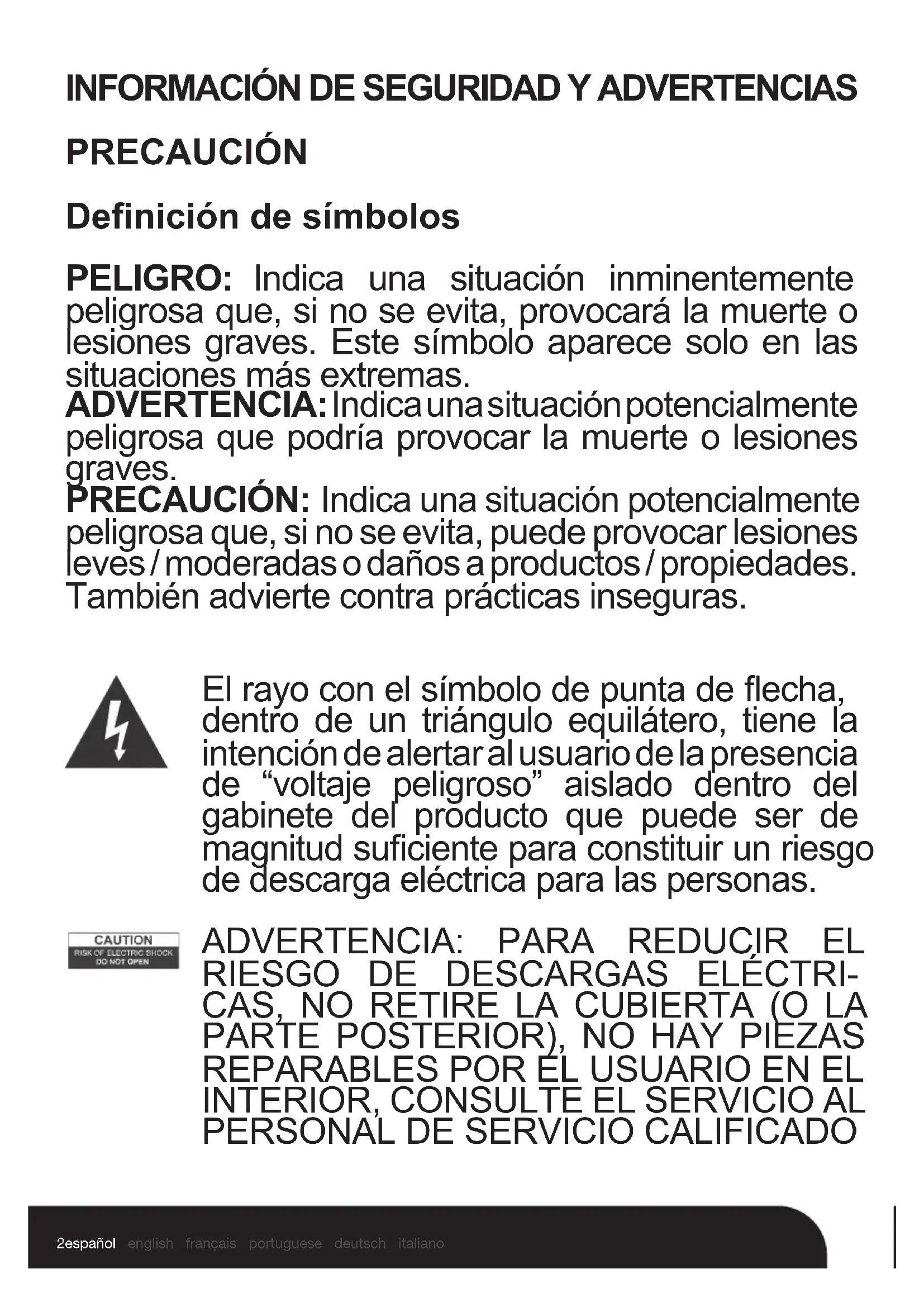 PRECAUCIÓN Denición de símbolos PELIGRO: Indica una situación inminentemente peligrosa que, si no se evita, provocará la muerte o lesiones graves. Este símbolo aparece solo en las situaciones más extremas. ADVERTENCIA: Indica una situación potencialmente peligrosa que podría provocar la muerte o lesiones graves. PRECAUCIÓN: Indica una situación potencialmente peligrosa que, si no se evita, puede provocar lesiones leves / moderadas o daños a productos / propiedades. También advierte contra prácticas inseguras. El rayo con el símbolo de punta de echa, dentro de un triángulo equilátero, tiene la intención de alertar al usuario de la presencia de “voltaje peligroso” aislado dentro del gabinete del producto que puede ser de magnitud suciente para constituir un riesgo de descarga eléctrica para las personas.