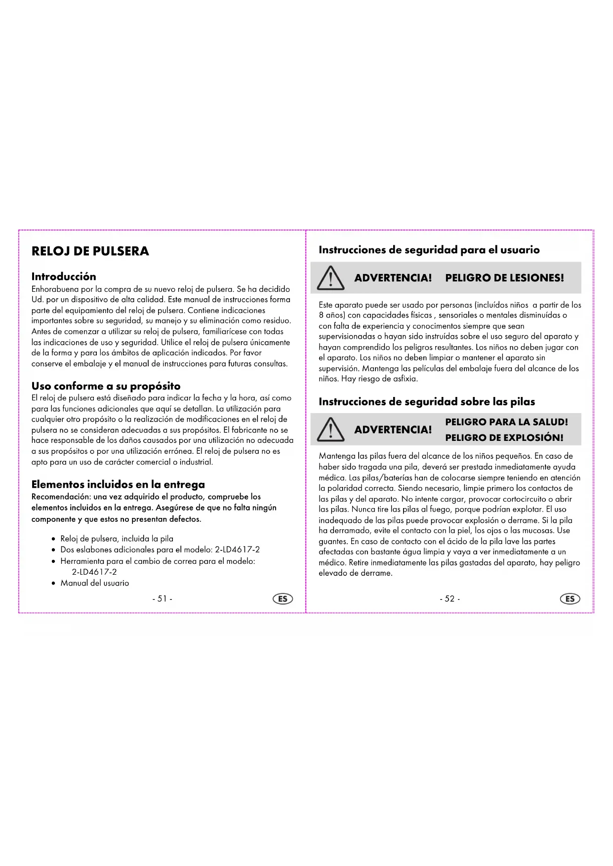 Indicaciones sobre su utilización y su seguridad Índice Índice ............................................................................................................ - 50 - Introducción ................................................................................................. - 51 - Uso conforme a su propósito ..................................................................... - 51 - Elementos incluidos en la entrega ............................................................. - 51 - Instrucciones de seguridad para el usuario Instrucciones de seguridad para el usuarioInstrucciones de seguridad para el usuario Instrucciones de seguridad para el usuario ........................................ - 52 - Instrucciones de seguridad sobre las pilas Instrucciones de seguridad sobre las pilasInstrucciones de seguridad sobre las pilas Instrucciones de seguridad sobre las pilas.......................................... - 52 - Ajuste de la hora ......................................................................................... - 53 - Instrucciones de ajuste para correas para el modelo 2-LD4617-2 ..... - 53 - Nota relativa a la limpieza ........................................................................ - 54 - Reemplazo de la batería (SR626SW) ..................................................... - 54 - Resistencia al agua ..................................................................................... - 54 - Estanqueidad del reloj de pulsera ............................................................ - 55 - Eliminación de las pilas .............................................................................. - 55 - Garantía de digi-tech gmbh ...................................................................... - 55 - Condiciones de la garantía ....................................................................... - 55 - Duración de la garantía y derecho de reclamación ............................... - 56 - Ámbito de la garantía ................................................................................ - 56 - Procedimiento en caso de garantía .......................................................... - 57 - Servicio técnico ........................................................................................... - 57 - Proveedor .................................................................................................... - 58 --