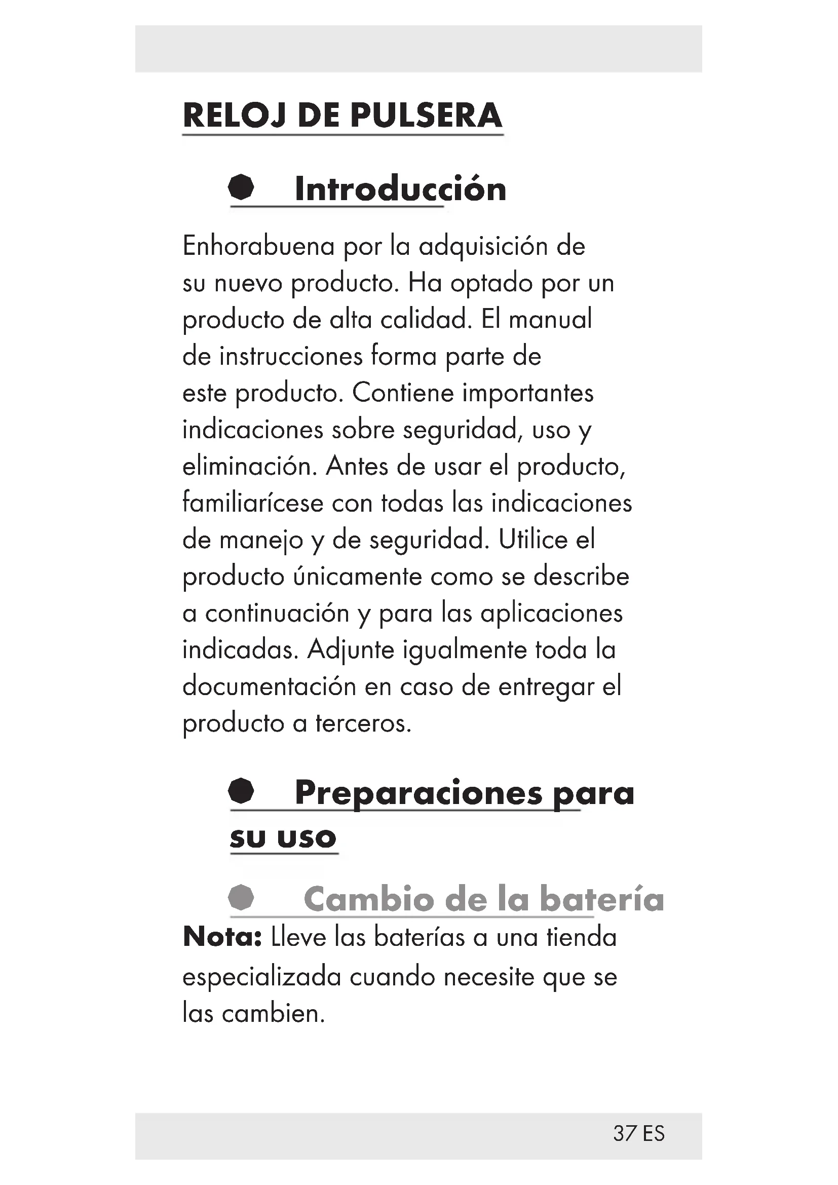§ Introducción Enhorabuena por la adquisición de su nuevo producto. Ha optado por un producto de alta calidad. El manual de instrucciones forma parte de este producto. Contiene importantes indicaciones sobre seguridad, uso y eliminación. Antes de usar el producto, familiarícese con todas las indicaciones de manejo y de seguridad. Utilice el producto únicamente como se describe a continuación y para las aplicaciones indicadas. Adjunte igualmente toda la documentación en caso de entregar el producto a terceros. § Preparaciones para su uso § Cambio de la batería Nota: Lleve las baterías a una tienda especializada cuando necesite que se las cambien.38 ES § Indicador