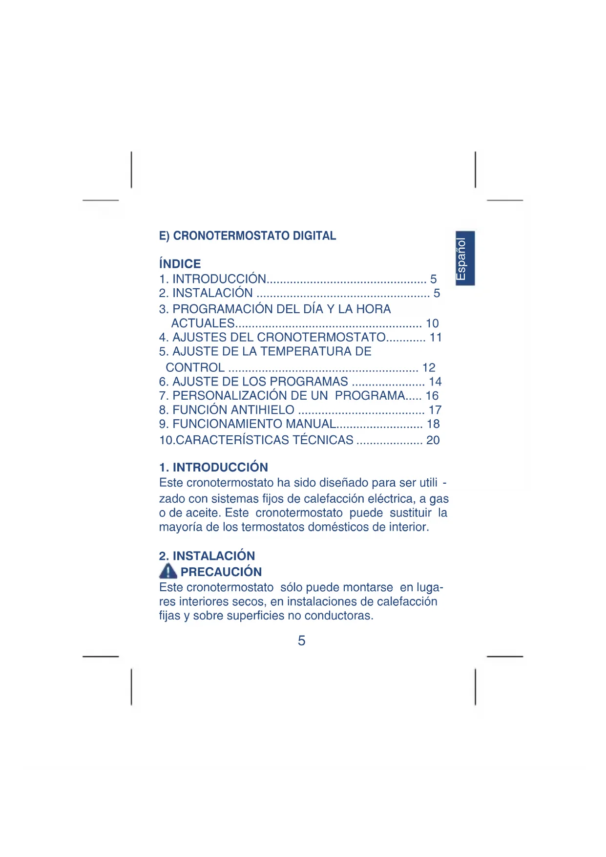 PRECAUCIÓN Este cronotermostato sólo puede montarse en luga- res interiores secos, en instalaciones de calefacción fijas y sobre superficies no conductoras.6 Español