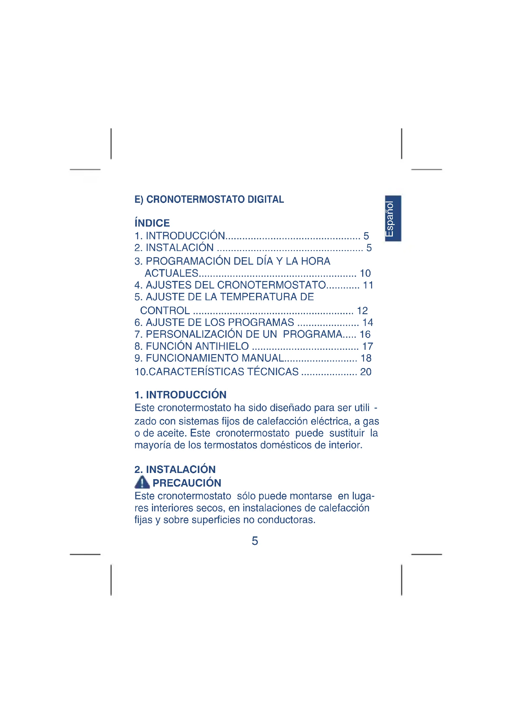 PRECAUCIÓN Este cronotermostato sólo puede montarse en luga- res interiores secos, en instalaciones de calefacción fijas y sobre superficies no conductoras.6 Español