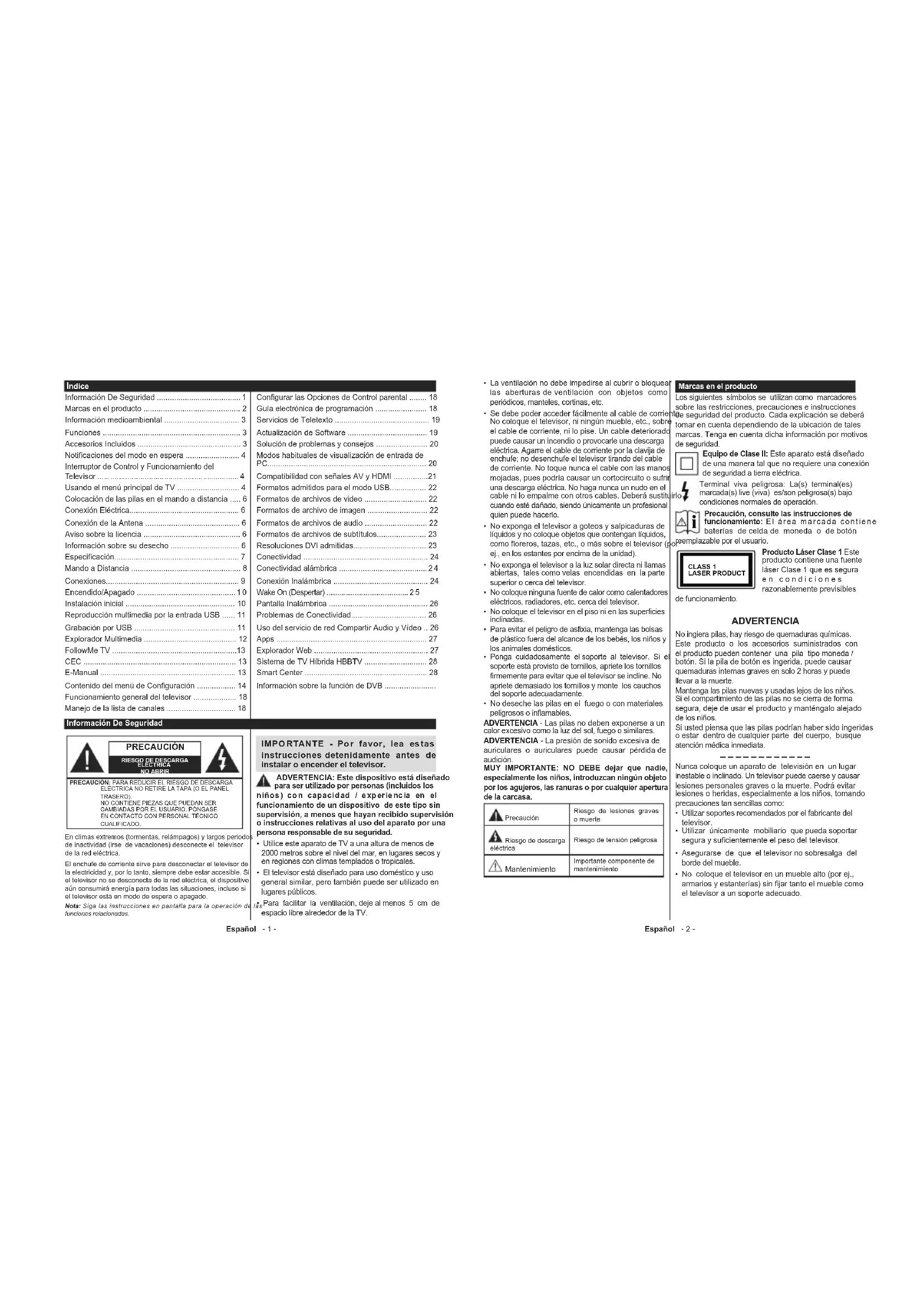 Résolution de l’écran (px) 1366x768Español - 1 - Información De Seguridad ndice Información De Seguridad .......................................1 Marcas en el producto ............................................. 2 Información medioambiental ................................... 3 Funciones ................................................................ 3 Accesorios Incluidos ................................................ 3 Notificaciones del modo en espera ......................... 4 Interruptor de Control y Funcionamiento del Telev is or . .. ... .. .. ... .. .. .. ... .. .. ... .. .. .. ... .. .. ... .. .. .. ............... 4 Usando el menú principal de TV ............................. 4 Colocación de las pilas en el mando a distancia ..... 6 Conexión Eléctrica................................................... 6 Conexión de la Antena ............................................ 6 Aviso sobre la licencia ............................................. 6 Información sobre su desecho ................................ 6 Especificación.......................................................... 7 Mando a Distancia ................................................... 8 Conexiones.............................................................. 9 Encendido/Apagado ..............................................10 Instalación inicial ................................................... 10 Reproducción multimedia por la entrada USB ...... 11 Grabación por USB ............................................... 11 Explorador Multimedia ........................................... 12 FollowMe TV ..........................................................13 CEC ....................................................................... 13 E-Manual ............................................................... 13 Contenido del menú de Configuración .................. 14 Funcionamiento general del televisor .................... 18 Manejo de la lista de canales ................................ 18 Configurar las Opciones de Control parental ........ 18 Guía electrónica de programación ........................ 18 Servicios de Teletexto ............................................ 19 Actualización de Software ..................................... 19 Solución de problemas y consejos ........................ 20 Modos habituales de visualización de entrada de PC.......................................................................... 20 Compatibilidad con señales AV y HDMI ................21 Formatos admitidos para el modo USB................. 22 Formatos de archivos de video ............................. 22 Formatos de archivo de imagen ............................ 22 Formatos de archivos de audio ............................. 22 Formatos de archivos de subtítulos....................... 23 Resoluciones DVI admitidas.................................. 23 Conectividad .......................................................... 24 Conectividad alámbrica .........................................24 Conexión Inalámbrica ............................................ 24 Wake On (Despertar) ............................................25 Pantalla Inalámbrica .............................................. 26 Problemas de Conectividad................................... 26 Uso del servicio de red Compartir Audio y Vídeo .. 26 Apps ...................................................................... 27 Explorador Web ..................................................... 27 Sistema de TV Híbrida HBBTV ............................. 28 Smart Center ......................................................... 28 Información sobre la función de DVB ........................ PRECAUCIÓN RIESGO DE DESCARGA ELÉCTRICANO ABRIRPRECAUCIÓN: PARA REDUCIR EL RIESGO DE DESCARGA ELÉCTRICA NO RETIRE LA TAPA (O EL PANEL TRASERO). NO CONTIENE PIEZAS QUE PUEDAN SER CAMBIADAS POR EL USUARIO. PÓNGASE EN CONTACTO CON PERSONAL TÉCNICO CUALIFICADO.Nota: Siga las instrucciones en pantalla para la operación de las funciones relacionadas. En climas extremos (tormentas, relámpagos) y largos periodos de inactividad (irse de vacaciones) desconecte el televisor de la red eléctrica. El enchufe de corriente sirve para desconectar el televisor de la electricidad y, por lo tanto, siempre debe estar accesible. Si el televisor no se desconecta de la red eléctrica, el dispositivo aún consumirá energía para todas las situaciones, incluso si el televisor está en modo de espera o apagado. IMPORTANTE - Por favor, lea estas instrucciones detenidamente antes de instalar o encender el televisor. ADVERTENCIA: Este dispositivo está diseñado para ser utilizado por personas (incluidos los niños) con capacidad / experiencia en el funcionamiento de un dispositivo de este tipo sin supervisión, a menos que hayan recibido supervisión o instrucciones relativas al uso del aparato por una persona responsable de su seguridad. Utilice este aparato de TV a una altura de menos de 2000 metros sobre el nivel del mar, en lugares secos y en regiones con climas templados o tropicales. El televisor está diseñado para uso doméstico y uso general similar, pero también puede ser utilizado en lugares públicos. Para facilitar la ventilación, deje al menos 5 cm de espacio libre alrededor de la TV. Español - 2 - La ventilación no debe impedirse al cubrir o bloquear las aberturas de ventilación con objetos como periódicos, manteles, cortinas, etc. Se debe poder acceder fácilmente al cable de corriente. No coloque el televisor, ni ningún mueble, etc., sobre el cable de corriente, ni lo pise. Un cable deteriorado puede causar un incendio o provocarle una descarga eléctrica. Agarre el cable de corriente por la clavija de enchufe; no desenchufe el televisor tirando del cable de corriente. No toque nunca el cable con las manos mojadas, pues podría causar un cortocircuito o sufrir una descarga eléctrica. No haga nunca un nudo en el cable ni lo empalme