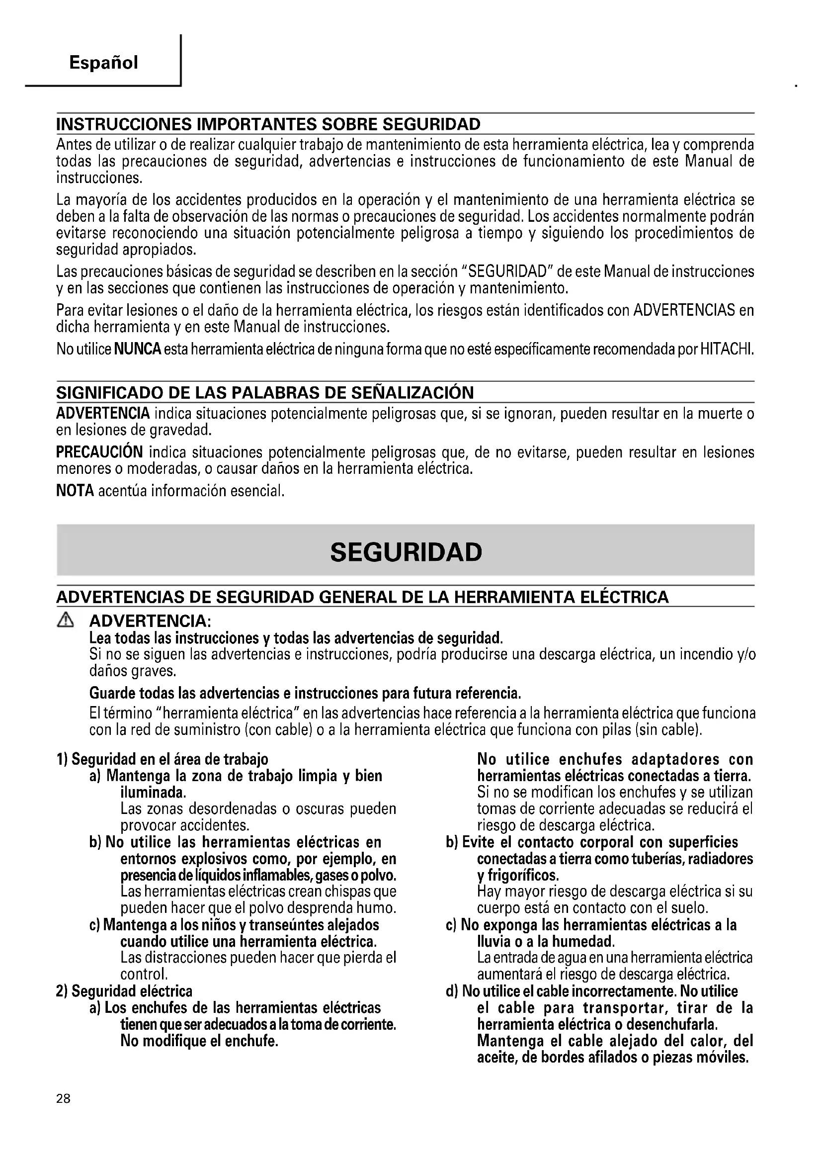 Antes de utilizar o de realizar cualquier trabajo de mantenimiento de esta herramienta eléctrica, lea y comprenda todas las precauciones de seguridad, advertencias e instrucciones de funcionamiento de este Manual de instrucciones. La mayoría de los accidentes producidos en la operación y el mantenimiento de una herramienta eléctrica se deben a la falta de observación de las normas o precauciones de seguridad. Los accidentes normalmente podrán evitarse reconociendo una situación potencialmente peligrosa a tiempo y siguiendo los procedimientos de seguridad apropiados. Las precauciones básicas de seguridad se describen en la sección “SEGURIDAD” de este Manual de instrucciones y en las secciones que contienen las instrucciones de operación y mantenimiento. Para evitar lesiones o el daño de la herramienta eléctrica, los riesgos están identificados con ADVERTENCIAS en dicha herramienta y en este Manual de instrucciones. No utilice NUNCA esta herramienta eléctrica de ninguna forma que no esté específicamente recomendada por HITACHI. SIGNIFICADO DE LAS PALABRAS DE SEÑALIZACIÓN ADVERTENCIA indica situaciones potencialmente peligrosas que, si se ignoran, pueden resultar en la muerte o en lesiones de gravedad. PRECAUCIÓN indica situaciones potencialmente peligrosas que, de no evitarse, pueden resultar en lesiones menores o moderadas, o causar daños en la herramienta eléctrica. NOTA acentúa información esencial. SEGURIDAD ADVERTENCIAS DE SEGURIDAD GENERAL DE LA HERRAMIENTA ELÉCTRICA ADVERTENCIA: Lea todas las instrucciones y todas las advertencias de seguridad. Si no se siguen las advertencias e instrucciones, podría producirse una descarga eléctrica, un incendio y/o daños graves. Guarde todas las advertencias e instrucciones para futura referencia. El término “herramienta eléctrica” en las advertencias hace referencia a la herramienta eléctrica que funciona con la red de suministro (con cable) o a la herramienta eléctrica que funciona con pilas (sin cable).