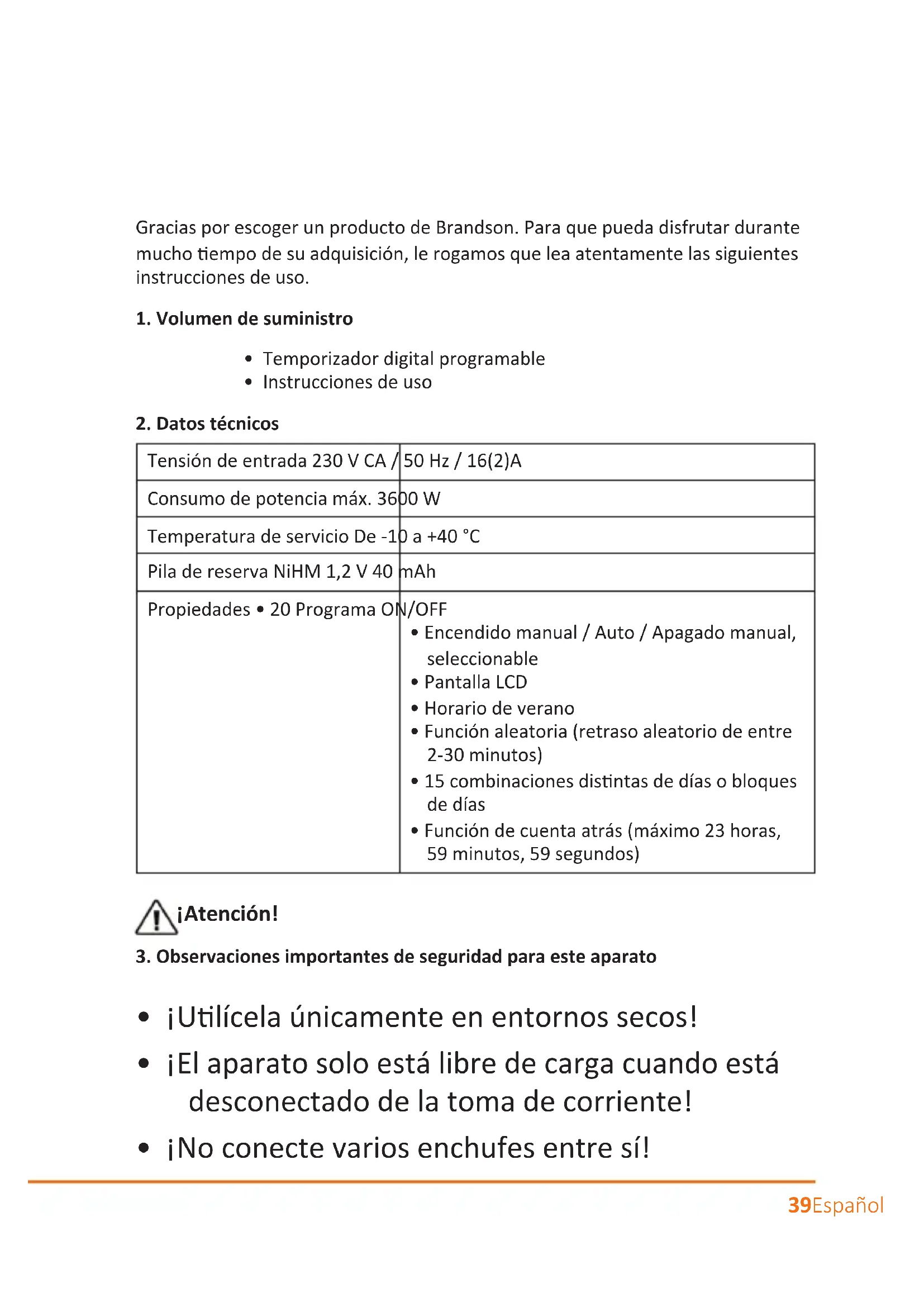 Gracias por escoger un producto de Brandon. Para que pueda disfrutar durante mucho tiempo de su adquisión, le rogamos que lea atentamente las siguientes instrucciones de uso.