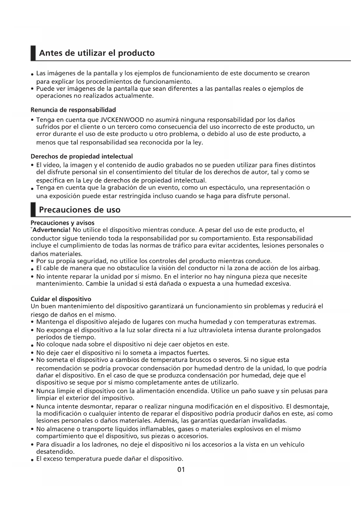 Precauciones para la instalación Precauciones de uso Limpiar el dispositivo Si observa algún problema con el dispositivo, desconecte la alimentación del mismo y, a continuación, póngase en contacto con su distribuidor o con el centro de servicio de JVCKENWOOD más cercano.03