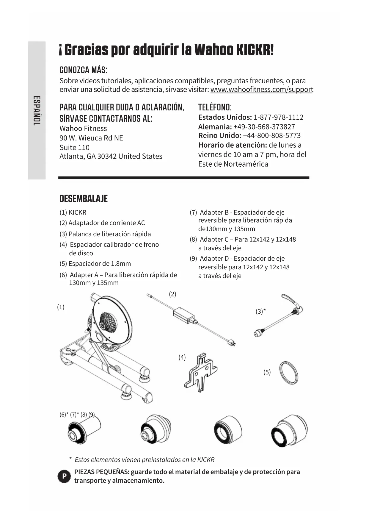 (3)* SCALE 0.750 (2) (1) (5) (4) Gracias por adquirir la Wahoo KICKR! CONOZCA MÁS: Sobre videos tutoriales, aplicaciones compatibles, preguntas frecuentes, o para enviar una solicitud de asistencia, sírvase visitar: www.wahoofitness.com/support PARA CUALQUIER DUDA O ACLARACIÓN, SÍRVASE CONTACTARNOS AL: Wahoo Fitness 90 W. Wieuca Rd NE Suite 110 Atlanta, GA 30342 United States TELÉFONO: Estados Unidos: 1-877-978-1112 Alemania: +49-30-568-373827 Reino Unido: +44-800-808-5773 Horario de atención: de lunes a viernes de 10 am a 7 pm, hora del Este de Norteamérica DESEMBALAJE (1) KICKR (2) Adaptador de corriente AC (3) Palanca de liberación rápida (4) Espaciador calibrador de freno de disco (5) Espaciador de 1.8mm (6) Adapter A – Para liberación rápida de 130mm y 135mm (7) Adapter B - Espaciador de eje reversible para liberación rápida de130mm y 135mm (8) Adapter C – Para 12x142 y 12x148 a través del eje (9) Adapter D - Espaciador de eje reversible para 12x142 y 12x148 a través del eje (6)* (7)* (8) (9) ESPAÑOL