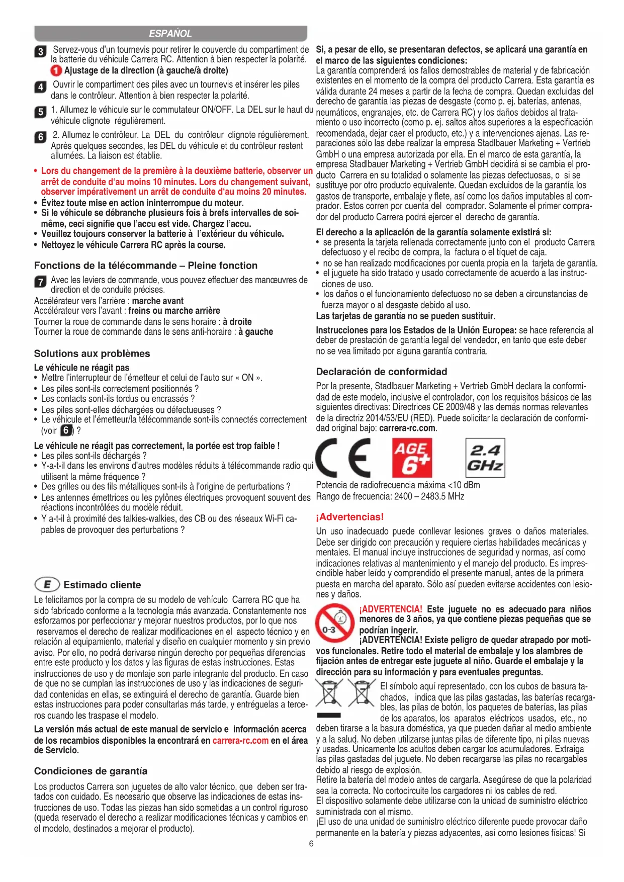 - Y a-t-il à proximité des talkies-walkies, des CB ou des réseaux Wi-Fi ca- pables de provoquer des perturbations ? Estimado cliente Le felicitamos por la compra de su modelo de vehículo Carrera RC que ha sido fabricado conforme a la tecnología más avanzada. Constantemente nos esforzamos por perfeccionar y mejorar nuestros productos, por lo que nos reservamos el derecho de realizar modificaciones en el aspecto técnico y en relación al equipamiento, material y diseño en cualquier momento y sin previo aviso. Por ello, no podrá derivarse ningún derecho por pequeñas diferencias entre este producto y los datos y las figuras de estas instrucciones. Estas instrucciones de uso y de montaje son parte integrante del producto. En caso de que no se cumplan las instrucciones de uso y las indicaciones de seguri- dad contenidas en ellas, se extinguirá el derecho de garantía. Guarde bien estas instrucciones para poder consultarlas más tarde, y entréguelas a terce- ros cuando les traspase el modelo. La versión más actual de este manual de servicio e información acerca de los recambios disponibles la encontrará en carrera-rc.com en el área de Servicio. Condiciones de garantía Los productos Carrera son juguetes de alto valor técnico, que deben ser tra- tados con cuidado. Es necesario que observe las indicaciones de estas ins- trucciones de uso. Todas las piezas han sido sometidas a un control riguroso (queda reservado el derecho a realizar modificaciones técnicas y cambios en el modelo, destinados a mejorar el producto). Si, a pesar de ello, se presentaran defectos, se aplicará una garantía en el marco de las siguientes condiciones: La garantía comprenderá los fallos demostrables de material y de fabricación existentes en el momento de la compra del producto Carrera. Esta garantía es válida durante 24 meses a partir de la fecha de compra. Quedan excluidas del derecho de garantía las piezas de desgaste (como p. ej. baterías, antenas, neumáticos, engranajes, etc. de Carrera RC) y los daños debidos al trata- miento o uso incorrecto (como p. ej. saltos altos superiores a la especificación recomendada, dejar caer el producto, etc.) y a intervenciones ajenas. Las re- paraciones sólo las debe realizar la empresa Stadlbauer Marketing + Vertrieb GmbH o una empresa autorizada por ella. En el marco de esta garantía, la empresa Stadlbauer Marketing + Vertrieb GmbH decidirá si se cambia el pro- ducto Carrera en su totalidad o solamente las piezas defectuosas, o si se sustituye por otro producto equivalente. Quedan excluidos de la garantía los gastos de transporte, embalaje y flete, así como los daños imputables al com- prador. Estos corren por cuenta del comprador. Solamente el primer compra- dor del producto Carrera podrá ejercer el derecho de garantía. El derecho a la aplicación de la garantía solamente existirá si: