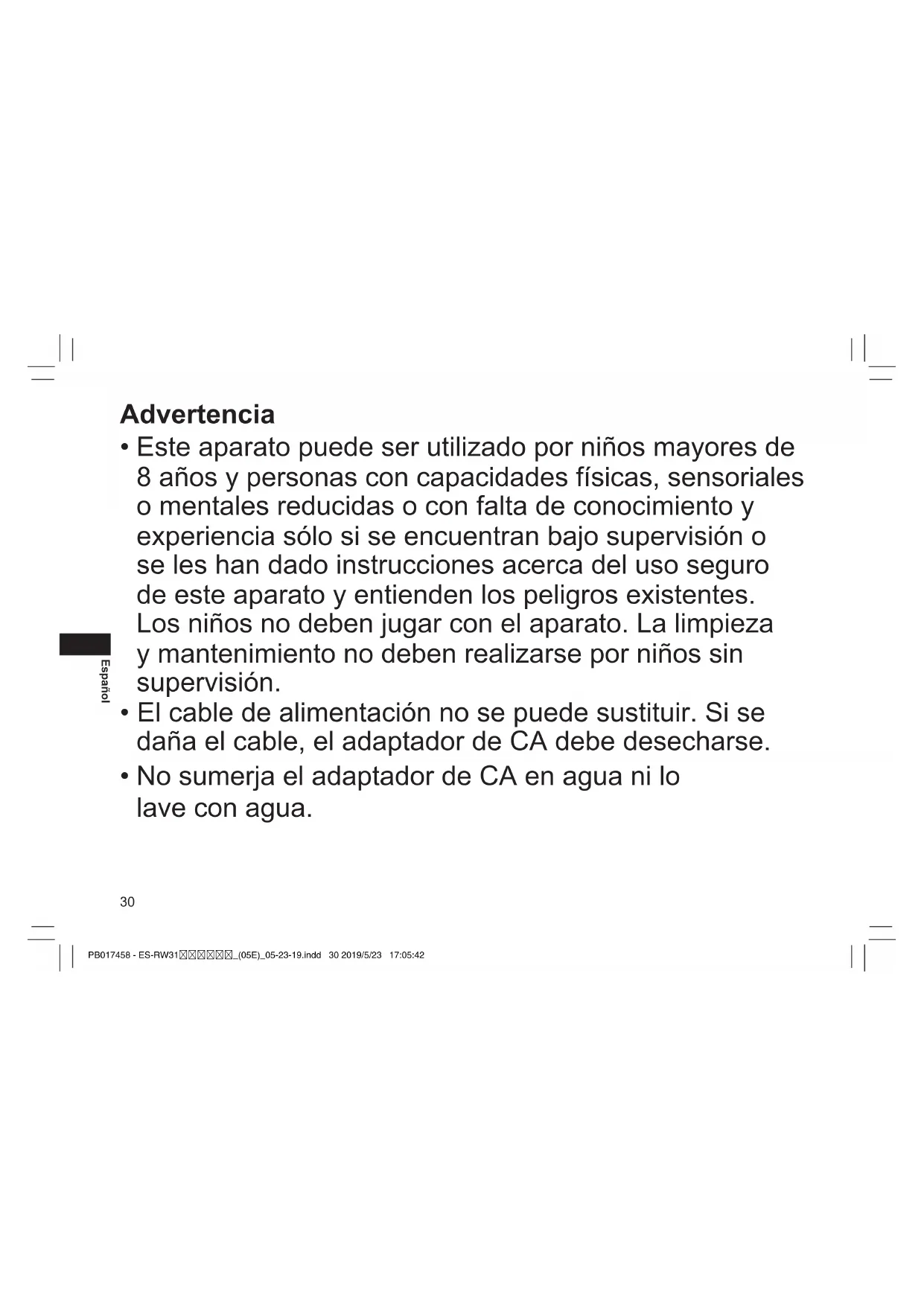 - El cable de alimentación no se puede sustituir. Si se daña el cable, el adaptador de CA debe desecharse. PB017458 - ES-RW31_(05E)_05-23-19.indd 30 2019/5/23 17:05:42 No sumerja el adaptador de CA en agua ni lo lave con agua.31 Español