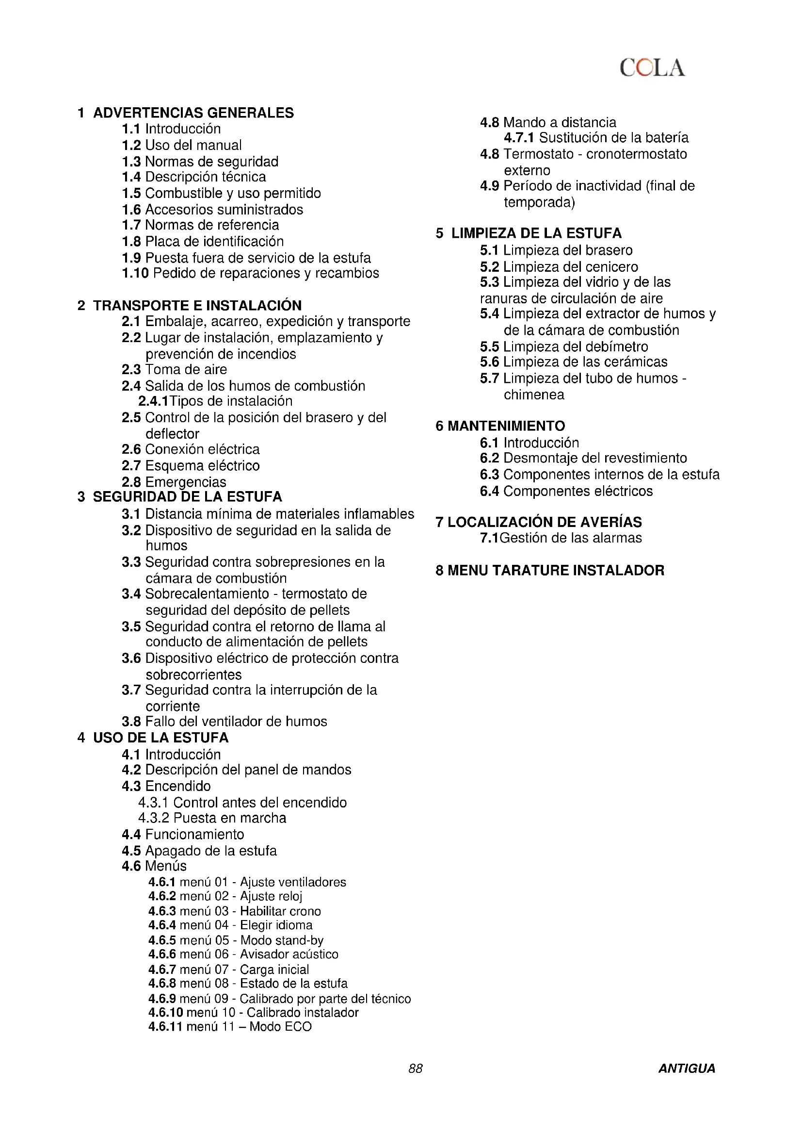 La Empresa Cola Srl garantiza sus produits segun las normas actualmente en vigor, excluyendo las piezas expuestos a normal usura.