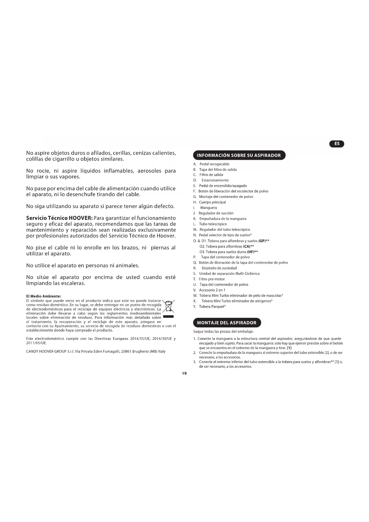 - O aspirador apresenta sobreaquecimento? Em caso armativo, a reposição automática ocorrerá passados cerca de 30 minutos. PT ESNo aspire objetos duros o afilados, cerillas, cenizas calientes, colillas de cigarrillo u objetos similares. No rocíe, ni aspire líquidos inflamables, aerosoles para limpiar o sus vapores. No pase por encima del cable de alimentación cuando utilice el aparato, ni lo desenchufe tirando del cable. No siga utilizando su aparato si parece tener algún defecto. Servicio Técnico HOOVER: Para garantizar el funcionamiento seguro y eficaz del aparato, recomendamos que las tareas de mantenimiento y reparación sean realizadas exclusivamente por profesionales autorizados del Servicio Técnico de Hoover. No pise el cable ni lo enrolle en los brazos, ni piernas al utilizar el aparato. No utilice el aparato en personas ni animales. No sitúe el aparato por encima de usted cuando esté limpiando las escaleras. El Medio Ambiente: El símbolo que puede verse en el producto indica que este no puede tratarse como residuo doméstico. En su lugar, se debe entregar en un punto de recogida de electrodomésticos para el reciclaje de equipos eléctricos y electrónicos. La eliminación debe llevarse a cabo según los reglamentos medioambientales locales sobre eliminación de residuos. Para información más detallada sobre el tratamiento, la recuperación y el reciclaje de este aparato, póngase en contacto con su Ayuntamiento, su servicio de recogida de residuos domésticos o con el establecimiento donde haya comprado el producto. Este electrodoméstico cumple con las Directivas Europeas 2014/35/UE, 2014/30/UE y 2011/65/UE. CANDY HOOVER GROUP S.r.l. Via Privata Eden Fumagalli, 20861 Brugherio (MB) Italy