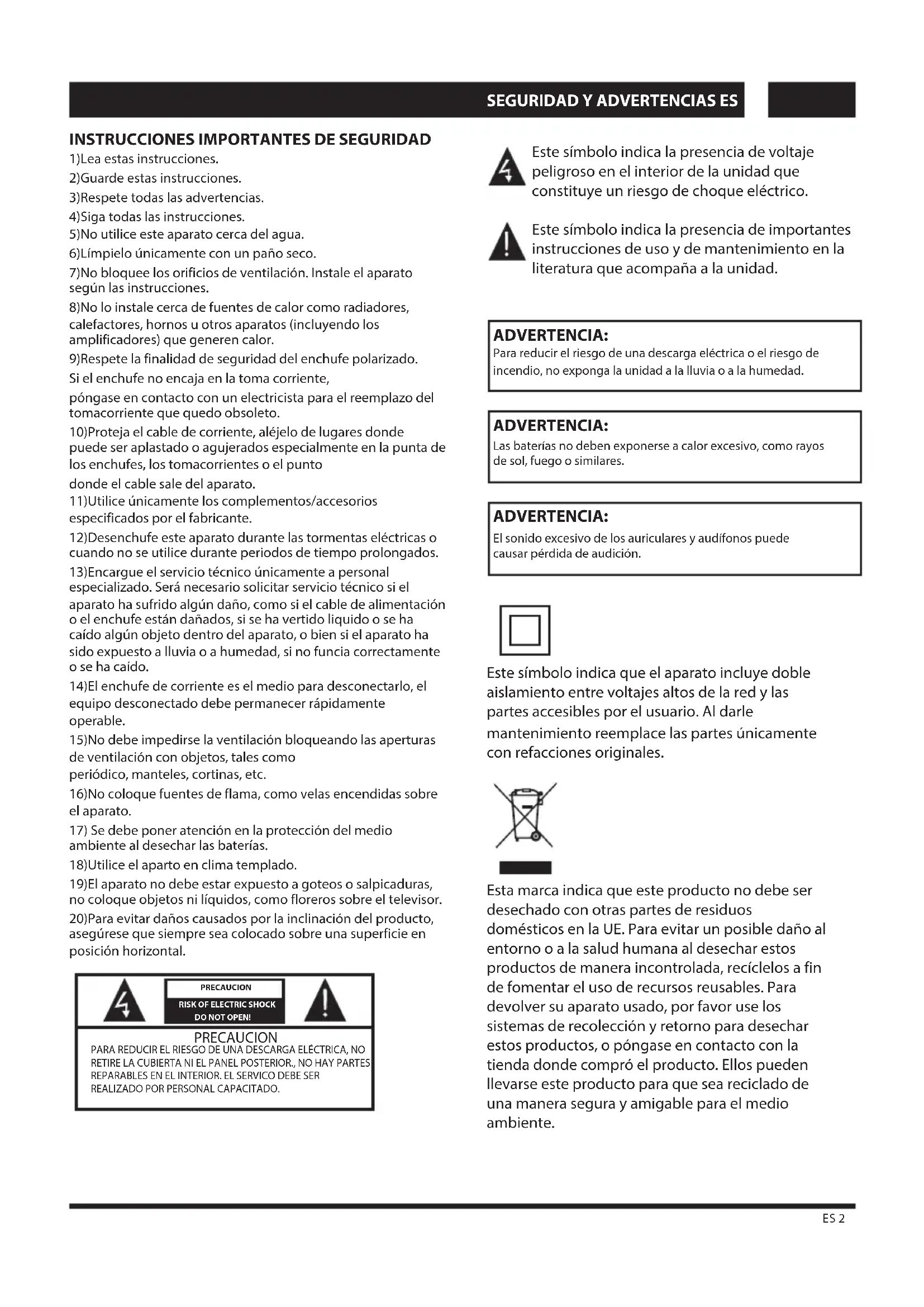 Este símbolo indica la presencia de voltaje peligroso en el interior de la unidad que constituye un riesgo de choque eléctrico. Este símbolo indica la presencia de importantes instrucciones de uso y de mantenimiento en la literatura que acompaña a la unidad. 1)Lea estas instrucciones. 2)Guarde estas instrucciones. 3)Respete todas las advertencias. 4)Siga todas las instrucciones. 5)No utilice este aparato cerca del agua. 6)Límpielo únicamente con un paño seco. 7)No bloquee los orificios de ventilación. Instale el aparato según las instrucciones. 8)No lo instale cerca de fuentes de calor como radiadores, calefactores, hornos u otros aparatos (incluyendo los amplificadores) que generen calor. 9)Respete la finalidad de seguridad del enchufe polarizado. Si el enchufe no encaja en la toma corriente, póngase en contacto con un electricista para el reemplazo del tomacorriente que quedo obsoleto. 10)Proteja el cable de corriente, aléjelo de lugares donde puede ser aplastado o agujerados especialmente en la punta de los enchufes, los tomacorrientes o el punto donde el cable sale del aparato. 11)Utilice únicamente los complementos/accesorios especificados por el fabricante. 12)Desenchufe este aparato durante las tormentas eléctricas o cuando no se utilice durante periodos de tiempo prolongados. 13)Encargue el servicio técnico únicamente a personal especializado. Será necesario solicitar servicio técnico si el aparato ha sufrido algún daño, como si el cable de alimentación o el enchufe están dañados, si se ha vertido liquido o se ha caído algún objeto dentro del aparato, o bien si el aparato ha sido expuesto a lluvia o a humedad, si no funcia correctamente o se ha caído. 14)El enchufe de corriente es el medio para desconectarlo, el equipo desconectado debe permanecer rápidamente operable. 15)No debe impedirse la ventilación bloqueando las aperturas de ventilación con objetos, tales como periódico, manteles, cortinas, etc. 16)No coloque fuentes de flama, como velas encendidas sobre el aparato.