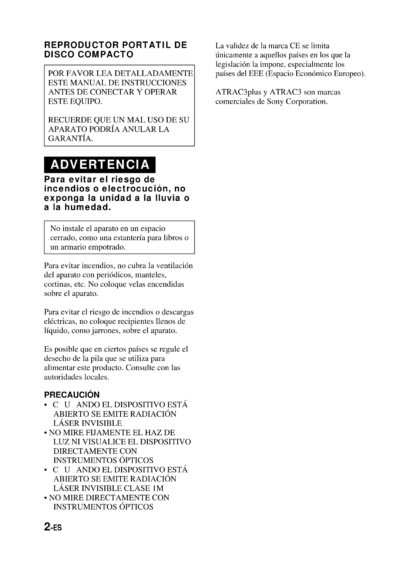 GARANTÍA. ADVERTENCIA Para evitar el riesgo de incendios o electrocución, no exponga la unidad a la lluvia o a la humedad. No instale el aparato en un espacio cerrado, como una estantería para libros o un armario empotrado. Para evitar incendios, no cubra la ventilación del aparato con periódicos, manteles, cortinas, etc. No coloque velas encendidas sobre el aparato. Para evitar el riesgo de incendios o descargas eléctricas, no coloque recipientes llenos de líquido, como jarrones, sobre el aparato. Es posible que en ciertos países se regule el desecho de la pila que se utiliza para alimentar este producto. Consulte con las autoridades locales. PRECAUCIÓN