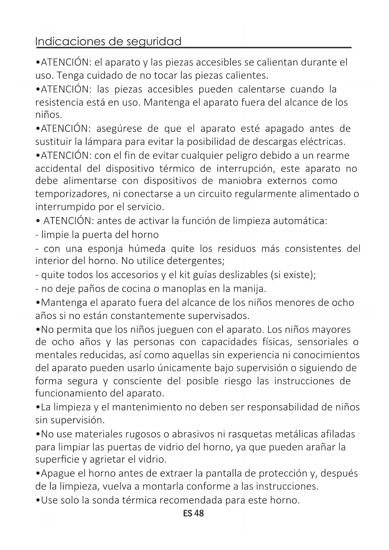 fuera del alcance de los niños. La primera vez que se enciende el horno puede producirse un humo de olor acre, causado por el primer calentamiento del adhesivo de los paneles de aislamiento que recubren el horno: se trata de un fenómeno absolutamente normal y, en caso de que se produzca, será preciso esperar a que cese el humo antes de introducir los alimentos. El fabricante declina toda responsabilidad en caso de no observar las instrucciones contenidas en este documento.
