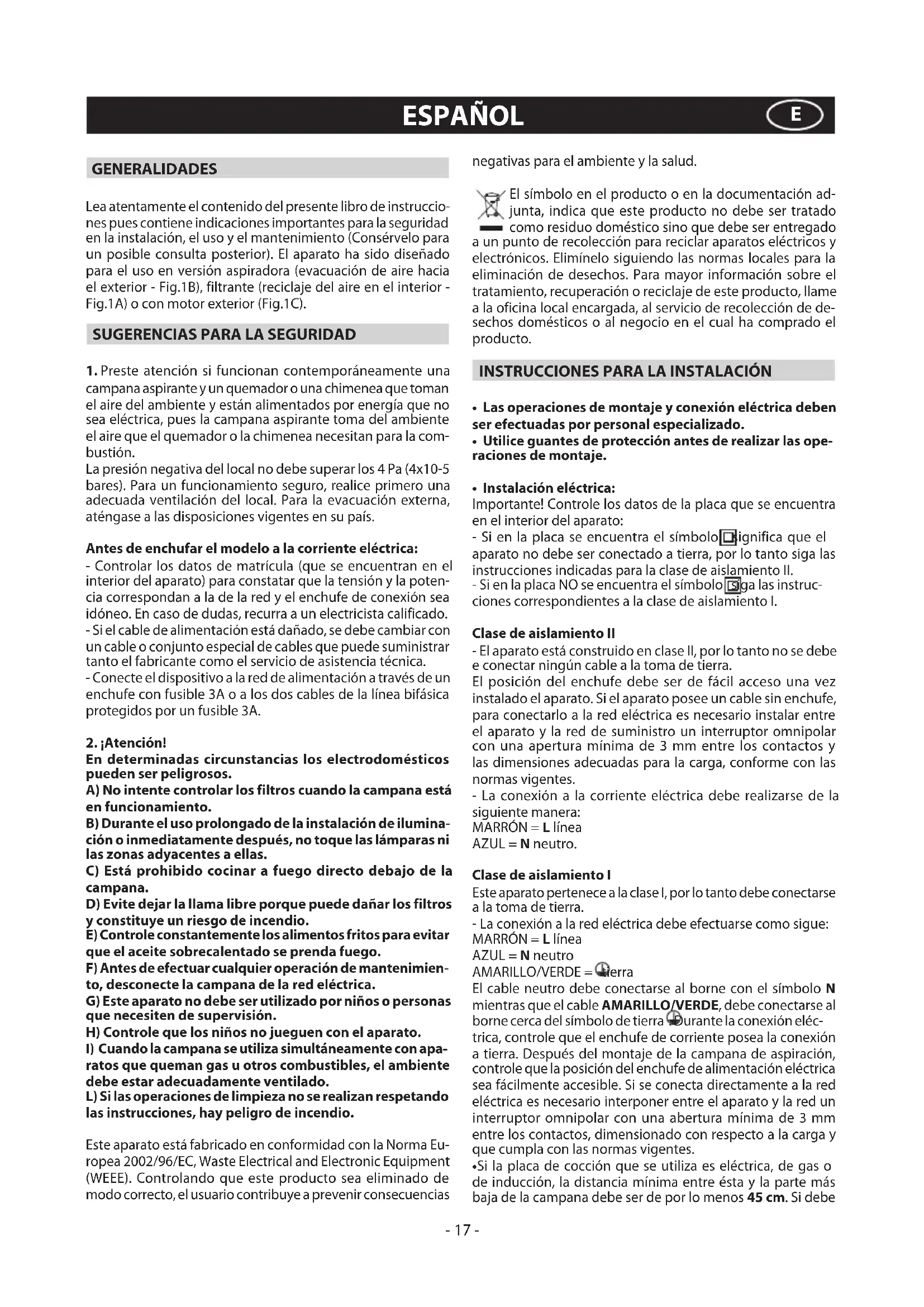 - Instalacióneléctrica: Importante! Controle los datos de la placa que se encuentra en el interior del aparato: - Si en la placa se encuentra el símbolo significa que el aparato no debe ser conectado a tierra, por lo tanto siga las instrucciones indicadas para la clase de aislamiento II. - Si en la placa NO se encuentra el símbolo siga las instruc- ciones correspondientes a la clase de aislamiento I. Clase de aislamiento II - El aparato está construido en clase II, por lo tanto no se debe e conectar ningún cable a la toma de tierra. El posición del enchufe debe ser de fácil acceso una vez instalado el aparato. Si el aparato posee un cable sin enchufe, para conectarlo a la red eléctrica es necesario instalar entre el aparato y la red de suministro un interruptor omnipolar con una apertura mínima de 3 mm entre los contactos y las dimensiones adecuadas para la carga, conforme con las normas vigentes. - La conexión a la corriente eléctrica debe realizarse de la siguiente manera: MARRÓN = L línea AZUL = N neutro. Clase de aislamiento I Este aparato pertenece a la clase I, por lo tanto debe conectarse a la toma de tierra. - La conexión a la red eléctrica debe efectuarse como sigue: MARRÓN = L línea AZUL = N neutro AMARILLO/VERDE = tierra El cable neutro debe conectarse al borne con el símbolo N mientras que el cable AMARILLO/VERDE, debe conectarse al borne cerca del símbolo de tierra . Durante la conexión eléc- trica, controle que el enchufe de corriente posea la conexión a tierra. Después del montaje de la campana de aspiración, controle que la posición del enchufe de alimentación eléctrica sea fácilmente accesible. Si se conecta directamente a la red eléctrica es necesario interponer entre el aparato y la red un interruptor omnipolar con una abertura mínima de 3 mm entre los contactos, dimensionado con respecto a la carga y que cumpla con las normas vigentes.