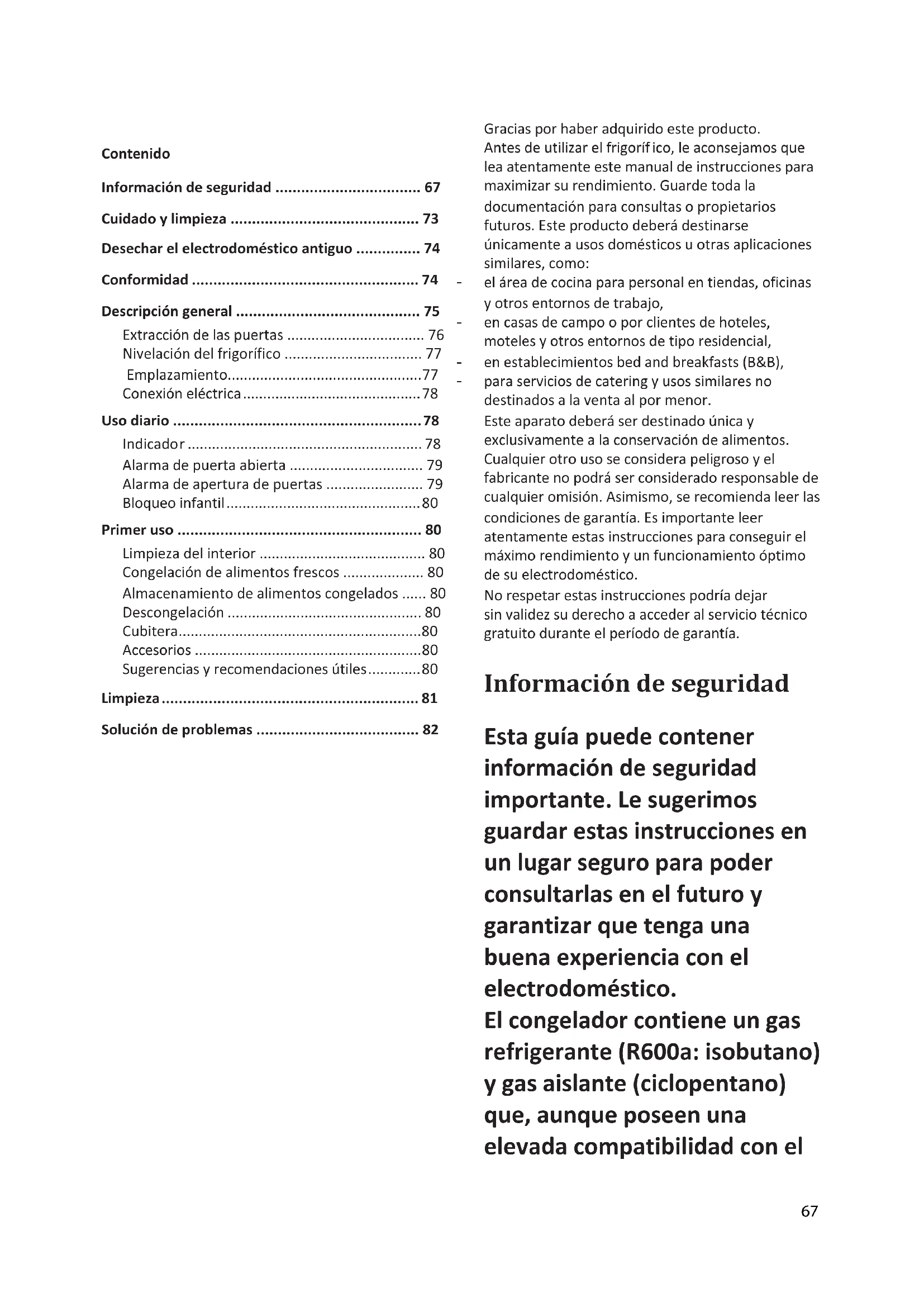 para servicios de catering y usos similares no destinados a la venta al por menor. Este aparato deberá ser destinado única y exclusivamente a la conservación de alimentos. Cualquier otro uso se considera peligroso y el fabricante no podrá ser considerado responsable de cualquier omisión. Asimismo, se recomienda leer las condiciones de garantía. Es importante leer atentamente estas instrucciones para conseguir el máximo rendimiento y un funcionamiento óptimo de su electrodoméstico. No respetar estas instrucciones podría dejar sin validez su derecho a acceder al servicio técnico gratuito durante el período de garantía. Información de seguridad Esta guía puede contener información de seguridad importante. Le sugerimos guardar estas instrucciones en un lugar seguro para poder consultarlas en el futuro y garantizar que tenga una buena experiencia con el electrodoméstico. El congelador contiene un gas refrigerante (R600a: isobutano) y gas aislante (ciclopentano) que, aunque poseen una elevada compatibilidad con el 67medio ambiente, son inflamables. Precaución: riesgo de incendio En caso de producirse daños en